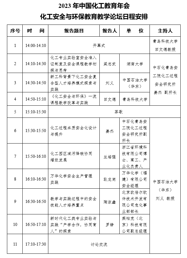 化工安全与环保对促进我国经济结构、能源结构、产业结构的转型升级,推动各行各业的高质量发展具有重要作用。“双碳”背景下,化工学科的地位和作用更加凸显,深入研讨化工安全与环保教育教学在实现“碳达峰、碳中和”目标中如何进一步发挥显著作用,非常必要。为进一步推动全国化工安全与环保教育教学在“双碳”背景下的创新发展,服务国家战略需求,由beat365正版唯一官网承办的“2023年中国化工教育年会化工安全与环保教育教学论坛”将于2023年12月9日在泉州召开,诚邀专家学者莅会,与广大同仁共聚泉州,开展化工安全与环保教育教学高端对话,共谋化工学科建设与高等教育创新发展大计。现将有关事项通知如下: