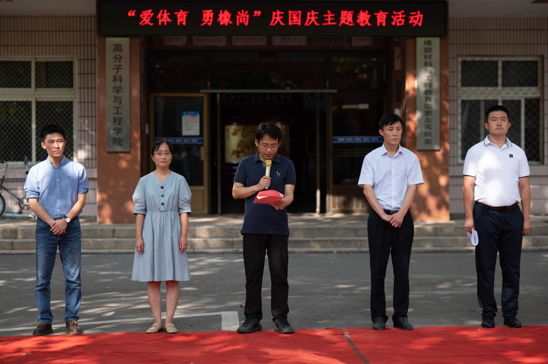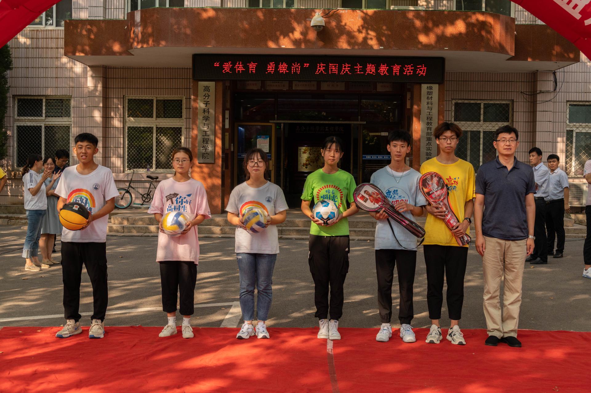 校团委书记毛常明、学院院长闫业海、学生处副处长王丽为趣味接力跑获奖同学颁奖。校团委副书记陈兵宣读了《关于高分子科学与工程学院成立体育联盟的批复》。副院长王庆富为篮球俱乐部举办的研究生本科生友谊赛开球。与会领导同切庆祖国72华诞“生日”蛋糕。健美协会进行了排舞展示。