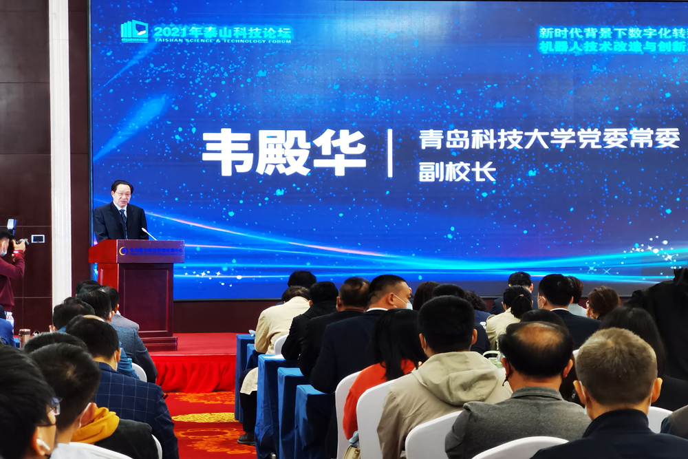 10月16日,由山东省科学技术协会主办,山东省机器人研究会、beat365正版唯一官网轮胎先进装备与关键材料国家工程研究中心承办,青岛市工业和信息化局、青岛市科学技术协会支持的“2021年泰山科技论坛——新时代背景下数字化转型与智能机器人技术改造与创新发展大会”在青岛蓝谷财富管理培训中心举办。青岛市工业和信息化局一级调研员孙成武,青岛市科学技术协会党组成员、副主席柳本才,学校党委常委、副校长韦殿华出席大会,高校、科研院所、企业约300余人参加大会。