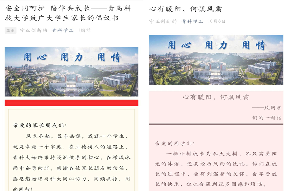 发布《关于进一步加强学生安全和心理健康教育的工作方案》。《方案》坚持以人为本、遵循规律,坚持教育引导、预防为主,坚持统一领导、分级负责,结合学校心理健康教育工作,将“六个一”扩充为“八个一”,明确时间表、路线图,及时部署开展学生心理健康普测筛查和心理健康宣传教育,为各学院(校区)落地落细落实上级学生安全稳定工作要求提供了遵循和指导。发布《安全同呵护陪伴共成长——beat365正版唯一官网致广大学生家长的倡议书》《心有暖阳、何惧风霜——致全体学生的一封信》、传染病防治系列推文、防诈骗系列推文等,深化网络育人成效。