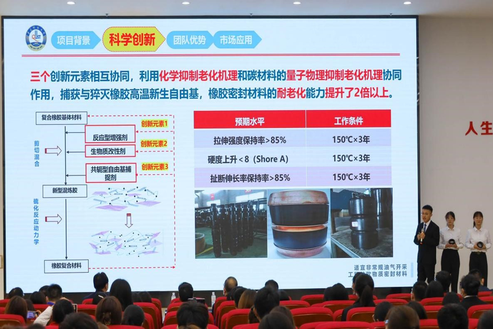 开营仪式前,学校2021年“挑战杯”大学生课外学术科技作品竞赛入围全国终审决赛的两项目团队——《以体育人,高校体育教学模式新探索》《适宜非常规油气开采工程的软物质密封材料》进行了现场路演,与会专家对项目进行了点评。