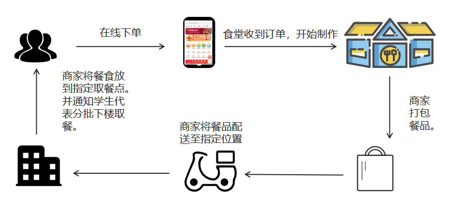 订餐者在线上下单,食堂收到订单后按照订单要求开始制作餐品,打包完毕后将餐品放置在窗口旁边自提点,学生自主到食堂窗口取餐点完成取餐。