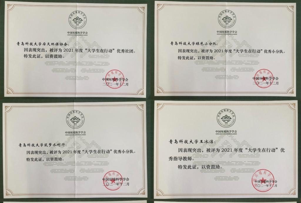 日前,由中国环境科学学会组织的2021年度“大学生在行动”优秀组织单位和个人的评选结果揭晓,环境学院后天环保协会获优秀社团;环境学院“绿色小分队”“筑梦水利行”志愿服务团队、化工学院赴鲁中工业园区“以绿为舟,生态为民”实践小分队均获“优秀小分队”;环境学院王冰洁获评优秀指导教师;环境学院刘翔宇,化工学院陈玮琪、王日萍获评优秀志愿者。