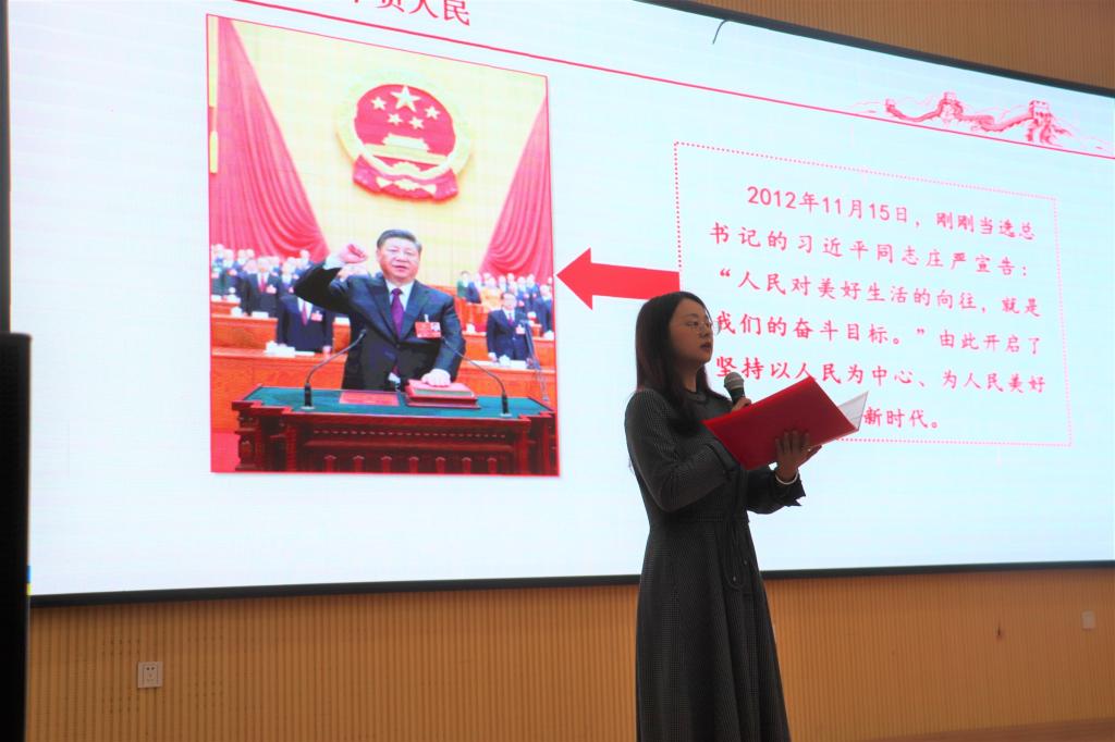 理论宣讲团成员宫姝丽、谭亦憬、李佳怡、潘柏宇、谭玥霏分别以《我将无我、不负人民》《精神的丰碑、信仰的力量》《忆星火燎原、建党初心不渝》《忆往昔岁月红船、提百年大好河山》《学习贯彻党的十九届六中全会精神》为题做了理论宣讲。