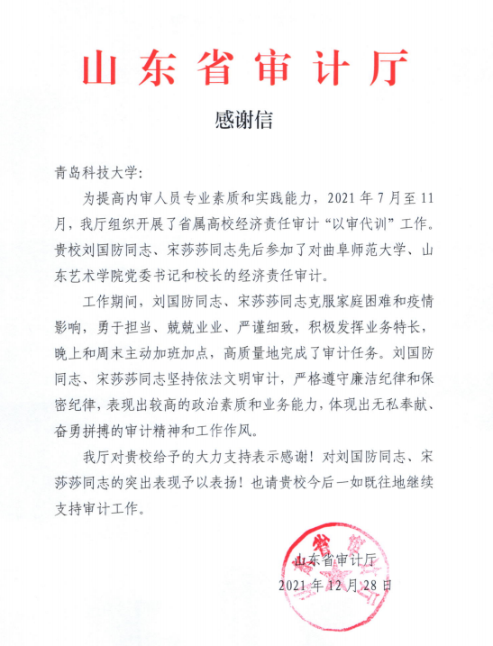 日前,学校收到山东省审计厅发来的感谢信,对beat365给予审计厅的工作支持表示感谢,对审计处刘国防、宋莎莎2位同志给予表扬。