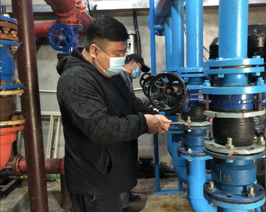 学校封闭管理期间,后勤处每天召开工作例会,总结部署工作,兢兢业业的完成服务保障工作。加强安全巡查和服务保障工作,基础维修人员24小时在岗,保证学校正常供水、供电、供暖。3月24日下午,崂山校区北区换热站暖气管道爆裂,需要紧急抢修,但受疫情防控影响,无法运送成型配件。崂山能源保障中心立即组织技术人员连夜焊接管道,一直工作的凌晨2点才堵住漏点,保障了北区正常供暖。
