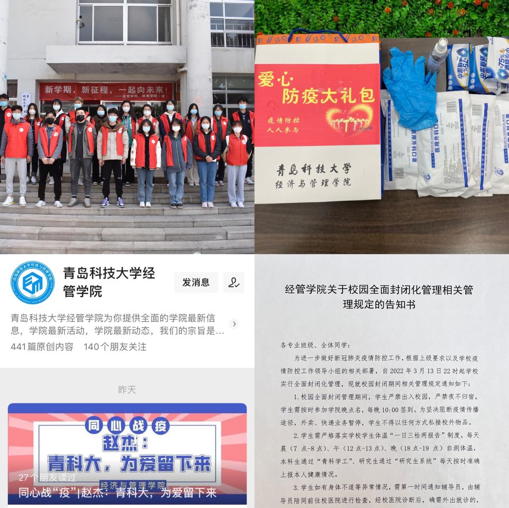 行动“快”,把住疫情防控主动权。第一时间自筹疫情防控物资,累计为学生发放口罩2万余只,消毒湿巾、免洗消毒液等防疫物资2500余件;第一时间面向全院学生发布《经管学院关于校园封闭化管理相关管理规定的告知书》;第一时间响应校团委号召,面向全院团员青年发布倡议书、招募令,组建疫情防控青年志愿者突击队,建成450人的志愿者储备池;第一时间组织全体专职辅导员撰写疫情防控主题“辅导员说”,主动发声,回应关切,把握学生舆论导向;真正用好校团委划拨的“千元抗疫特殊团费”,确保专项团费在抗击疫情工作中切实发挥传递组织温暖、凝聚团员青年、解决实际困难的作用。