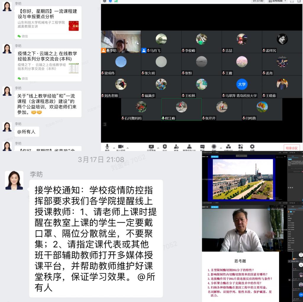 学校于3月14日起教学活动全部改为线上网课形式,避免网络拥挤学生分为单双号到教室上课,并提供“爱课堂”“超星”“学堂在线”和“智慧树”四个平台的学习支持。相比在教室里上课,任课老师的线上教学的任务更重,隔着屏幕去保证每堂课的效果。学院教学院长李昉在教师群分享线上授课的技巧和操作流程,帮助任课教师及时掌握平台管理和使用功能,主动为老师们排忧解难、解决问题。同时也指出在特殊时期,教师们必须积极应对,充分利用现代信息技术,弥补线上教学的不足,克服网络教学的弊端,以“泰山崩于前而不变色,麋鹿兴于左而目不瞬”的精神带领学生翱翔于每一节空中课堂。