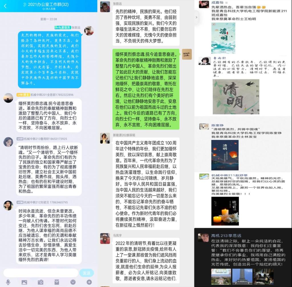 缅怀先烈志,共筑中国魂——开展“铭记历史,追思先烈”主题感悟分享会。同学们纷纷在班级QQ群、微信群中表达对于先烈的纪念与致敬。学院学生会赵帅迪说,“先烈的精神,民族的荣光。他们经历了各种坎坷,英勇不屈,由弱到强,实现民族的复兴。我们今天的幸福生活来之不易,我们要勿忘昨天的苦难辉煌,无愧今天的使命担当,不负明天的伟大梦想”,诉说着对于英雄先烈的钦佩与敬仰。传承先烈风骨、铭记先烈遗志、弘扬英烈精神,争做时代新人。