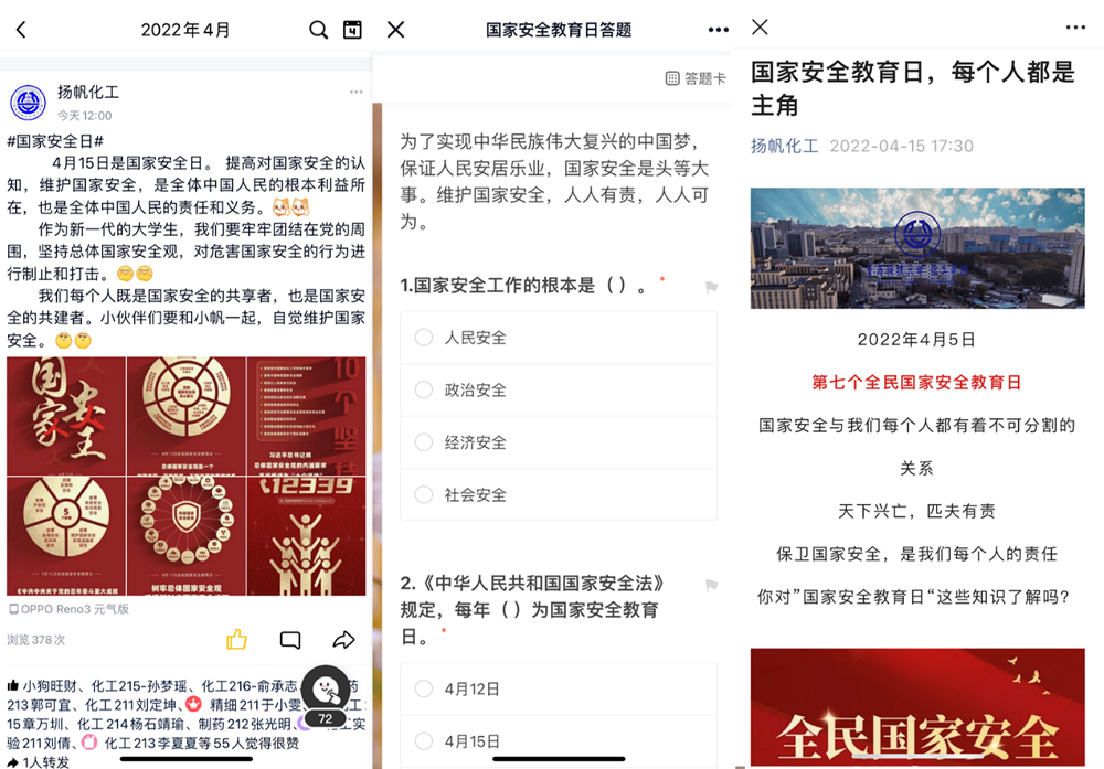 为深入学习贯彻总体国家安全观,进一步增强全民国家安全意识,结合疫情防控形势和学校工作实际,化工学院积极开展“以青春之名,担安全使命”全民国家安全教育日主题教育活动,将爱国之心融入思政教育,将护国之情嵌入安全教育,引导大学生提升国家安全意识、自觉维护国家安全。