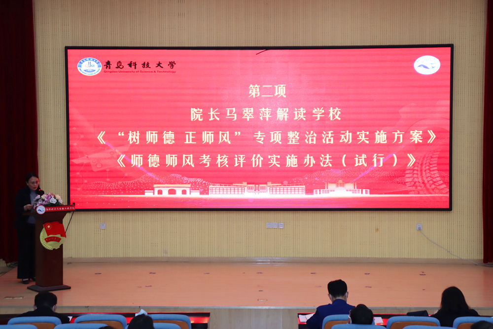 院长马翠萍解读了学校《“树师德 正师风”专项整治活动实施方案》和《师德师风考核评价实施办法(试行)》。党总支书记周宪锋宣读学院《“树师德 正师风”专项整治活动实施细则》,要求全院教师以此为契机,正师德、铸师魂、修师风,坚定为党育人、为国育才初心使命,努力做精于“传道授业解惑”的“经师”和“人师”,做到言为士则、行为世范,做一名让党放心、人民信任、学生喜欢的“四有”好老师,以实际行动迎接党的二十大胜利召开。