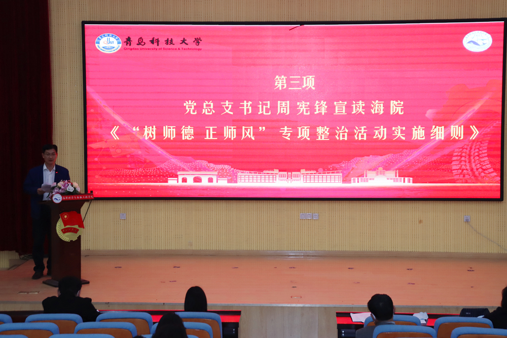 为进一步强化师德师风建设,提高学院教师依法执教、教书育人、为人师表的自觉性,4月28日下午,海洋科学与生物工程学院在尚舜讲学厅举行“树师德 正师风”师德师风专项整治启动仪式,学院班子成员及全体教师参加。