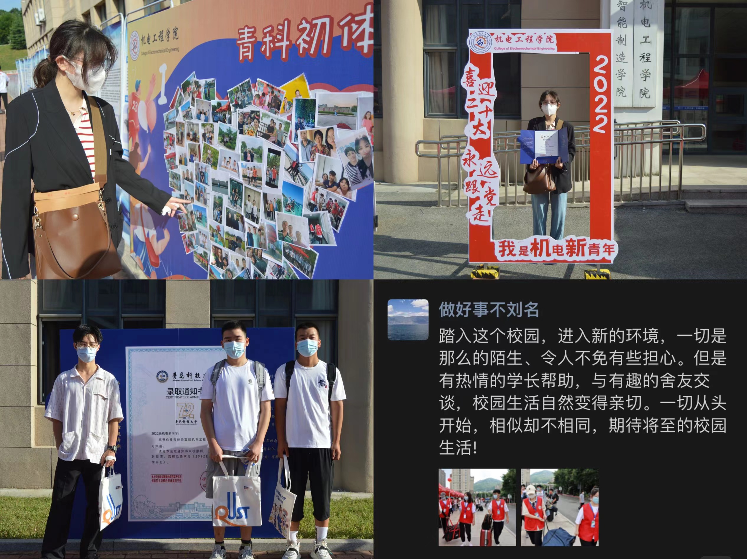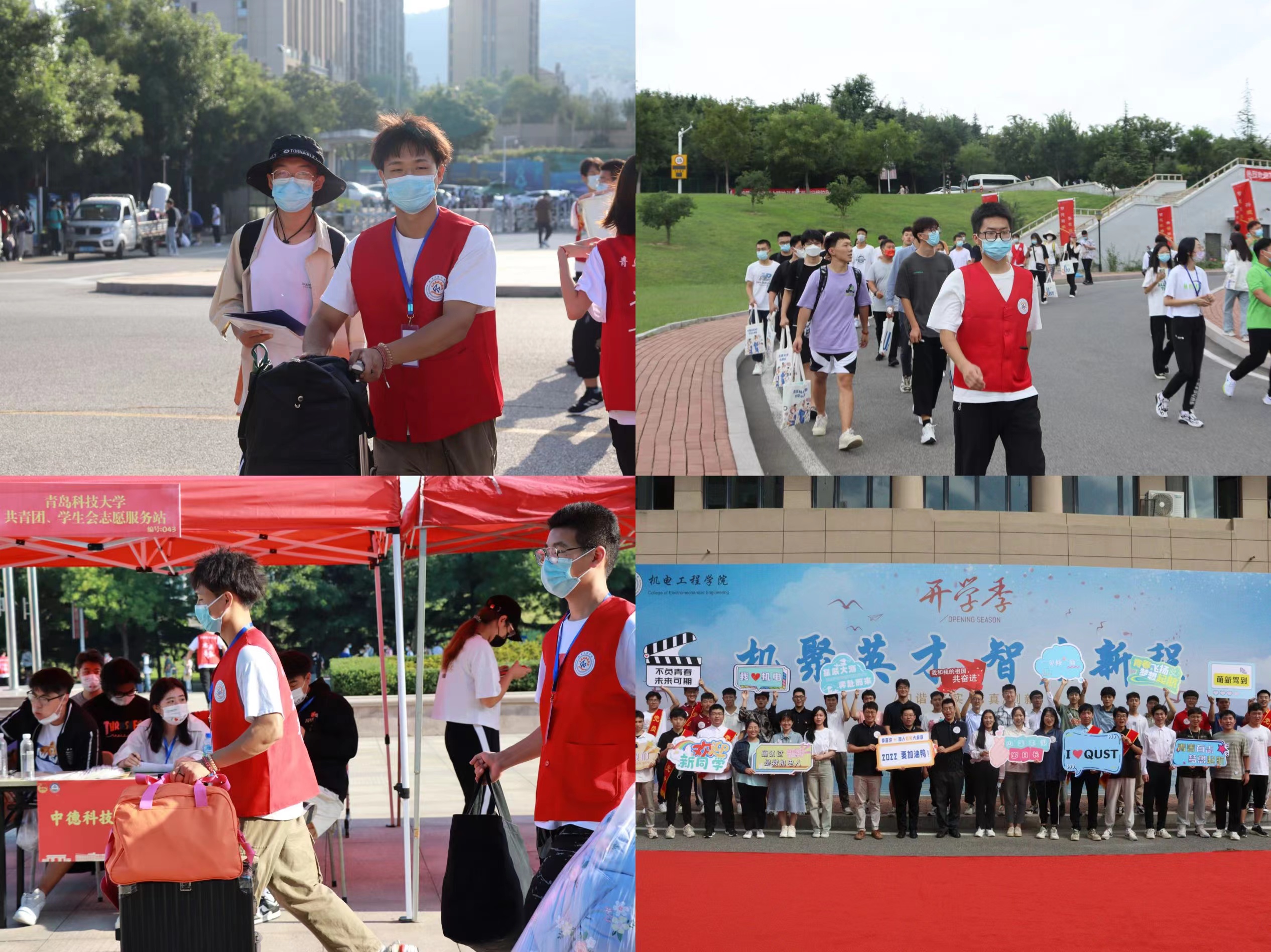 用情护航,奉献、细致、温暖,顺利迎接大学生活。学院坚持守正创新,分工协同,热心服务,把方便留给新生,把满意留给家长。学院志愿者在开学完成新生100%对接,建立2022级官方新生年级群、专业群、班级群,就校园布局、学业课程、科大美食、周边环境等进行介绍答疑。在入学前详细摸排学生健康码、行程码、核酸检测证明、所在地疫情等信息,每日收集更新新增疫情地点和场所,在学院群和班级群中发布疫情防控期间的入校温馨提示,全力保证入校新生符合疫情防控政策规定。报到当天,学院在迎新工作点设置“党员先锋岗”“绿色通道”“志愿服务亭”等,为新生现场引导答疑。学院的迎新志愿者奔走在校园的各个角落,为新生指引方向,协助新生搬运行李,帮助新生完成报到手续,全面推动志愿服务实现新提升。每一名志愿者用饱满的热情、踏实的行动和对志愿服务精神的坚守彰显了机电学子的青春风采,践行了新时代大学生的责任担当。