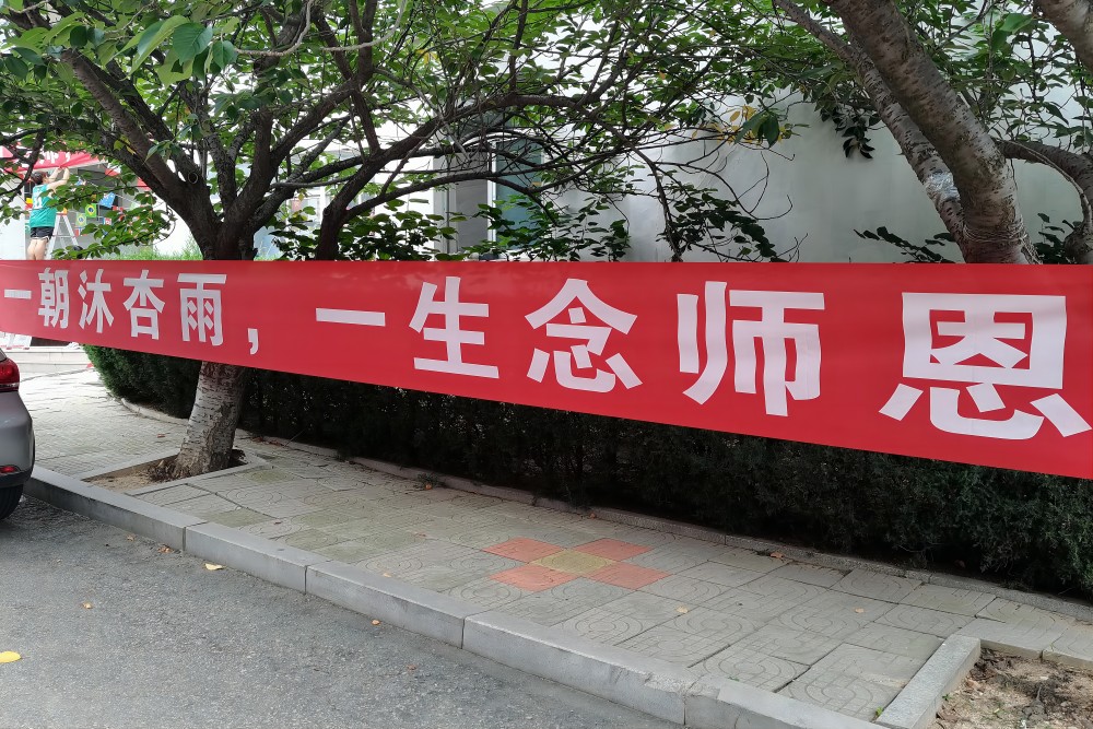 学院楼下,“一朝沐杏雨,一生念师恩”的横幅悬挂于向学院楼入口延伸的道路一侧,门口悬挂“老师,您好”的横幅标语,表达着对全体教师的亲切问候。