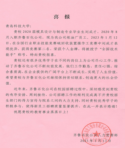 刘成才所在单位齐鲁石化公司特向学校发来喜报,对学校就业服务工作和对齐鲁石化公司长期以来输送的高质量人才表示衷心感谢,对学校就业指导中心和所在院系工作给予了高度评价,对刘成才的综合素质和工作业绩表示高度认可。刘成才说:“感谢学校老师的精心培育,在校期间积累的专业技能、培养的学习能力、塑造的创新思维、锤炼的意志品格,为我踏上工作岗位奠定了基础,让我更加自信、更加扎实、更加有力的走向未来。”