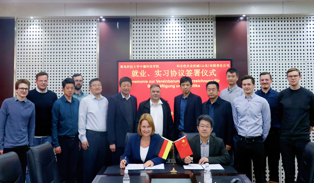 4月17日下午,中德科技学院与科乐收农业机械(山东)有限责任公司校企就业实习合作签约仪式在学院会议室B4117举行。科乐收农业机械有限责任公司谷物事业部全球人力资源总裁Kunkies Antje(安捷)、科乐收(中国)首席财务官Idekeit Gregor(格雷戈)、人力资源总监梁卫东,中德科技学院院长李庆党、党委副书记兼副院长马骥、副院长郭建章、外事部、机械工程教研室负责人、“在华机械工程”硕士项目留学生参加会议,会议由院长李庆党主持。