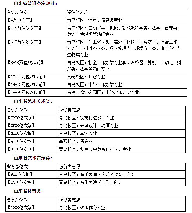 根据学校历年录取成绩,结合志愿填报方法,学校提供以下【稳健类】推荐意见,仅供参考,具体请考生及家长以自身实际情况为准。下列公布的位次是山东省总排名位次。