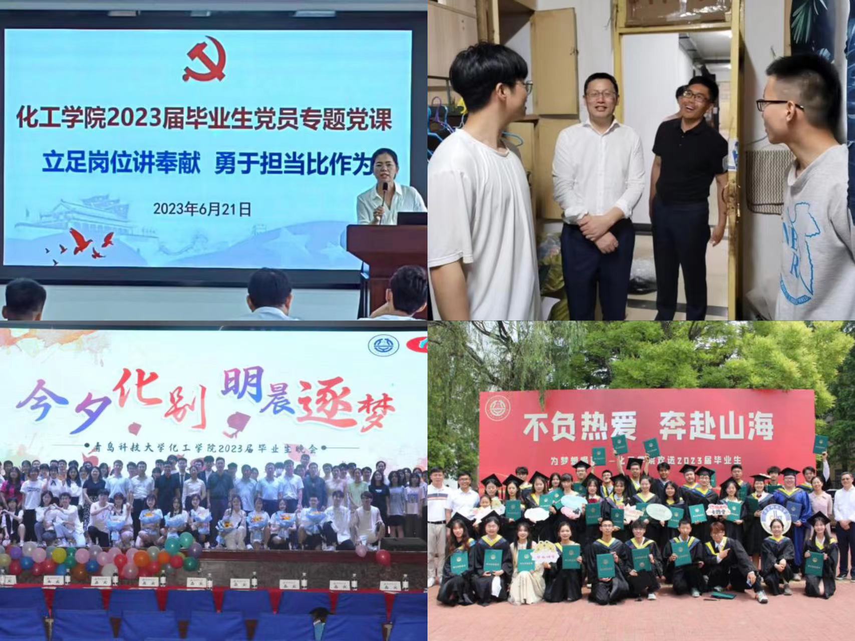 化工学院团委创新形式,丰富内容,开展毕业生系列主题教育活动。化工学院党委书记孙明媚以“立足岗位讲奉献,勇于担当比作为”为题,为全体毕业生党员上了一堂生动的专题党课。学院党政领导到学生宿舍亲切看望毕业生,为即将踏上人生新征程的毕业学子送上真挚的问候和温暖的祝福。通过举办“今夕化别·明晨逐梦”青春思政课暨2023届毕业生毕业晚会、“我与母校合个影”、“爱心搬运”、毕业生座谈会、毕业生主题班会等形式,传递师生深情祝福,增强毕业生爱校荣校情怀,引导毕业生“离校不离心”。