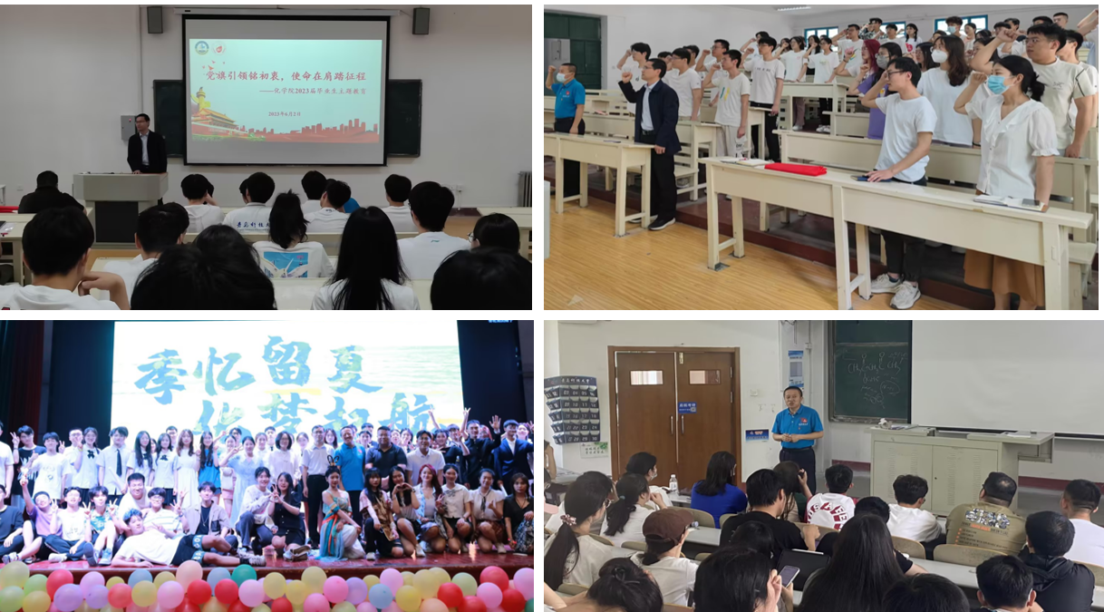 化学院团委开展“季忆留夏 化梦起航”毕业季系列主题特色活动。学院党委书记王德宝为毕业生党员上“最后一堂党课”,带领毕业生党员重温入党誓词,切实做好青年学生思想引领工作。拍摄《师生寄语》等多部毕业主题视频,为2023届毕业生记录青春美好瞬间。举办主题毕业晚会,师生齐聚一堂欢送2023届毕业生。举办优秀毕业生座谈会暨表彰大会,立标杆、树榜样,激励化院青年成良材。