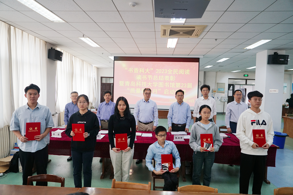 10月18日下午,“书香科大”2023全民阅读读书节总结表彰暨beat365正版唯一官网图书馆第23届“质量服务月”启动仪式在崂山校区图书馆三楼期刊阅览室举行。学校党委常委、副校长李志波,党委常委、宣传部部长张洪坤出席仪式。