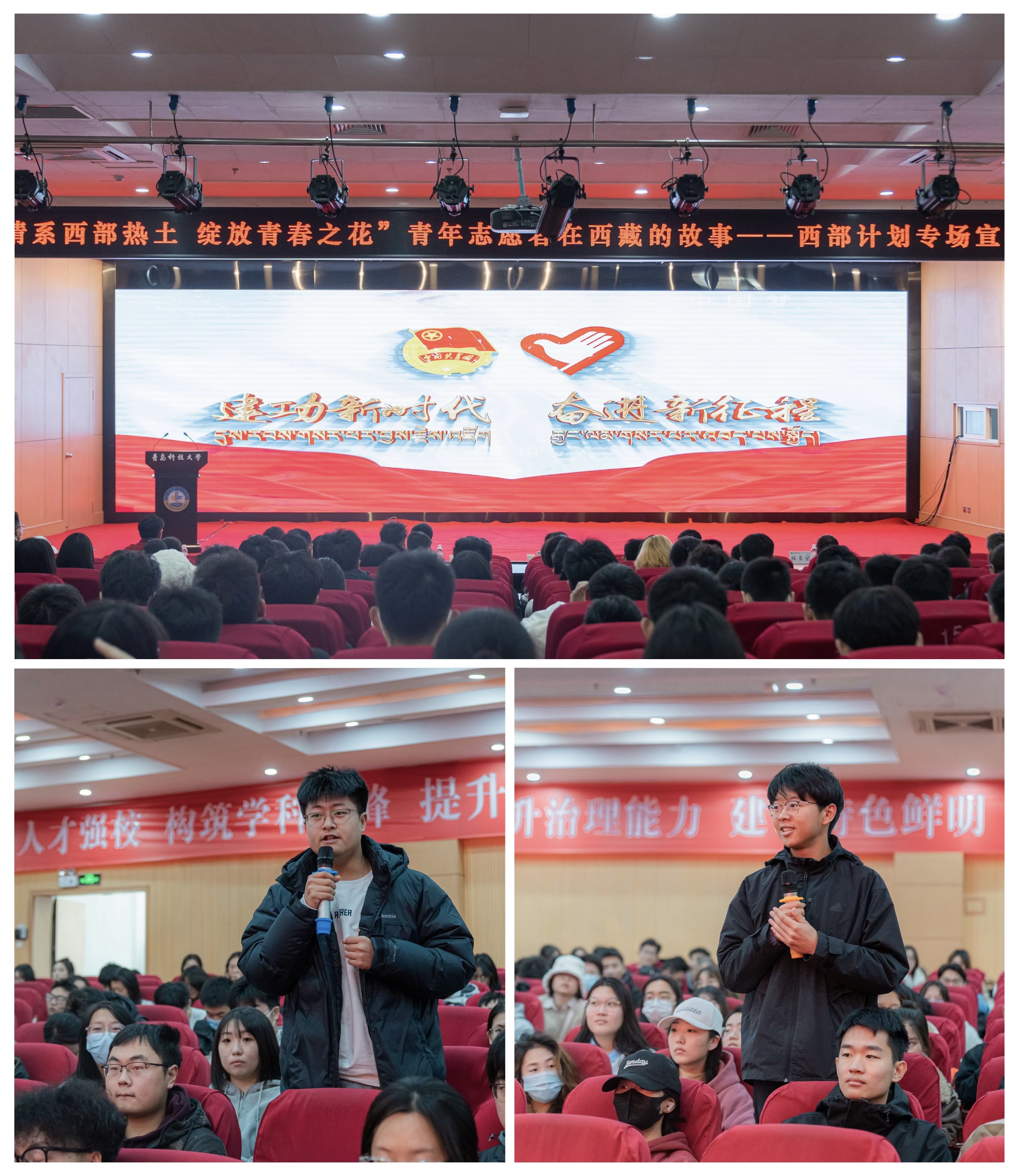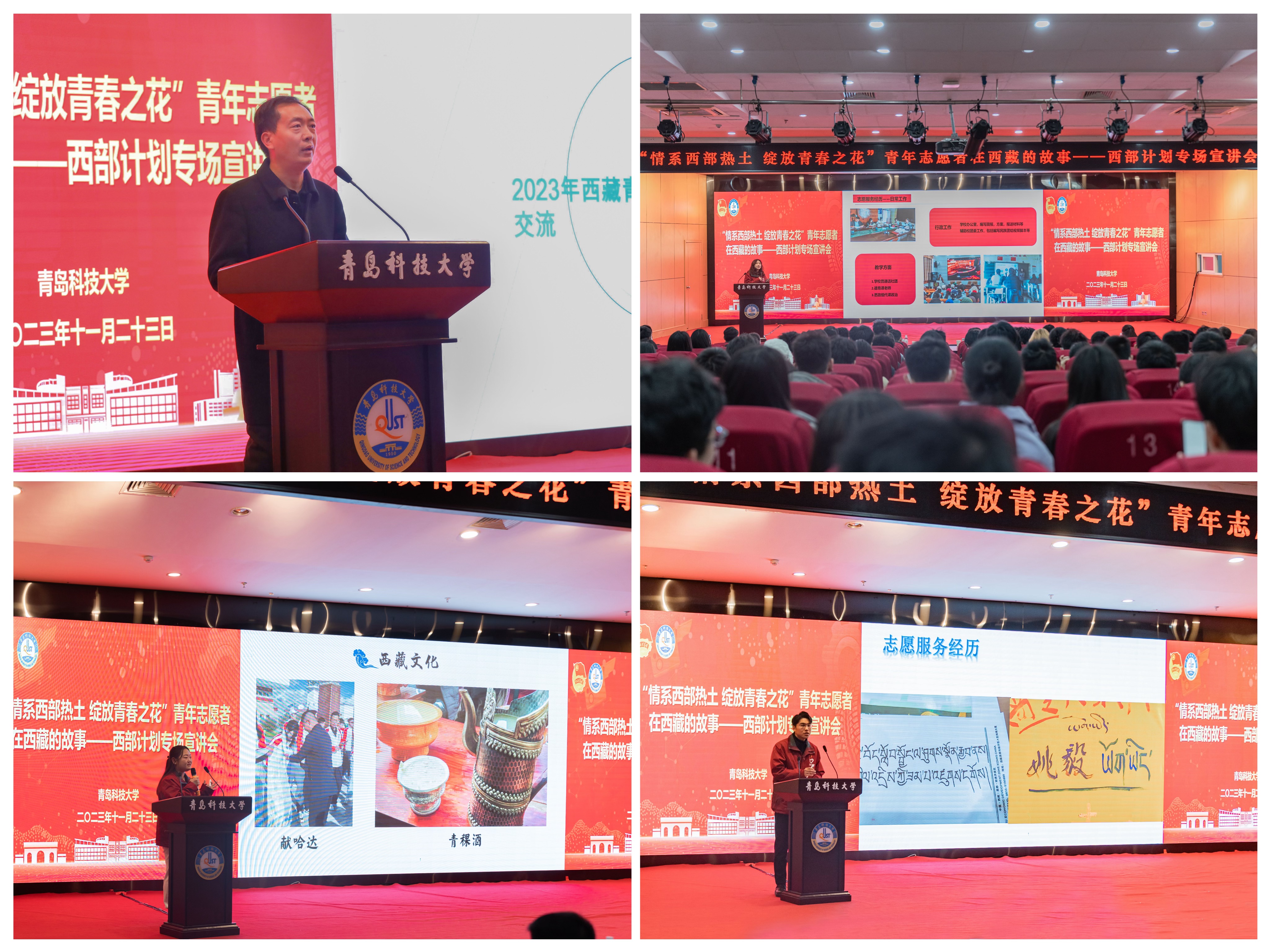 会前,党委常委、副校长丁林会见刘传磊一行,丁林对西部计划西藏专项来青科大宣讲表示热烈欢迎。会上,全体师生共同观看了《西部计划西藏专项欢迎你》宣传片。刘传磊就西藏自治区基本区情、历史文化以及发展现状,西藏青年志愿服务开展情况,西部计划西藏专项的招募条件及相关政策三个方面进行讲解。大学生志愿服务西部计划西藏专项志愿者代表温雅迪、程雪宇、姚毅分别以《教育点亮梦想,为人生创造希望》《在祖国西部书写青春故事》《鲁东心·藏东情》为主题,结合自身经历,从走入西部的风土人情、选择西部的初心使命、服务西部的收获感悟等方面出发,畅谈了作为西部计划志愿者的切身体会,用实际行动诠释了志愿精神,让现场师生倍感鼓舞。现场青年学生针对西部计划报考条件、选拔标准、发展规划等问题与宣讲团成员进行充分交流。