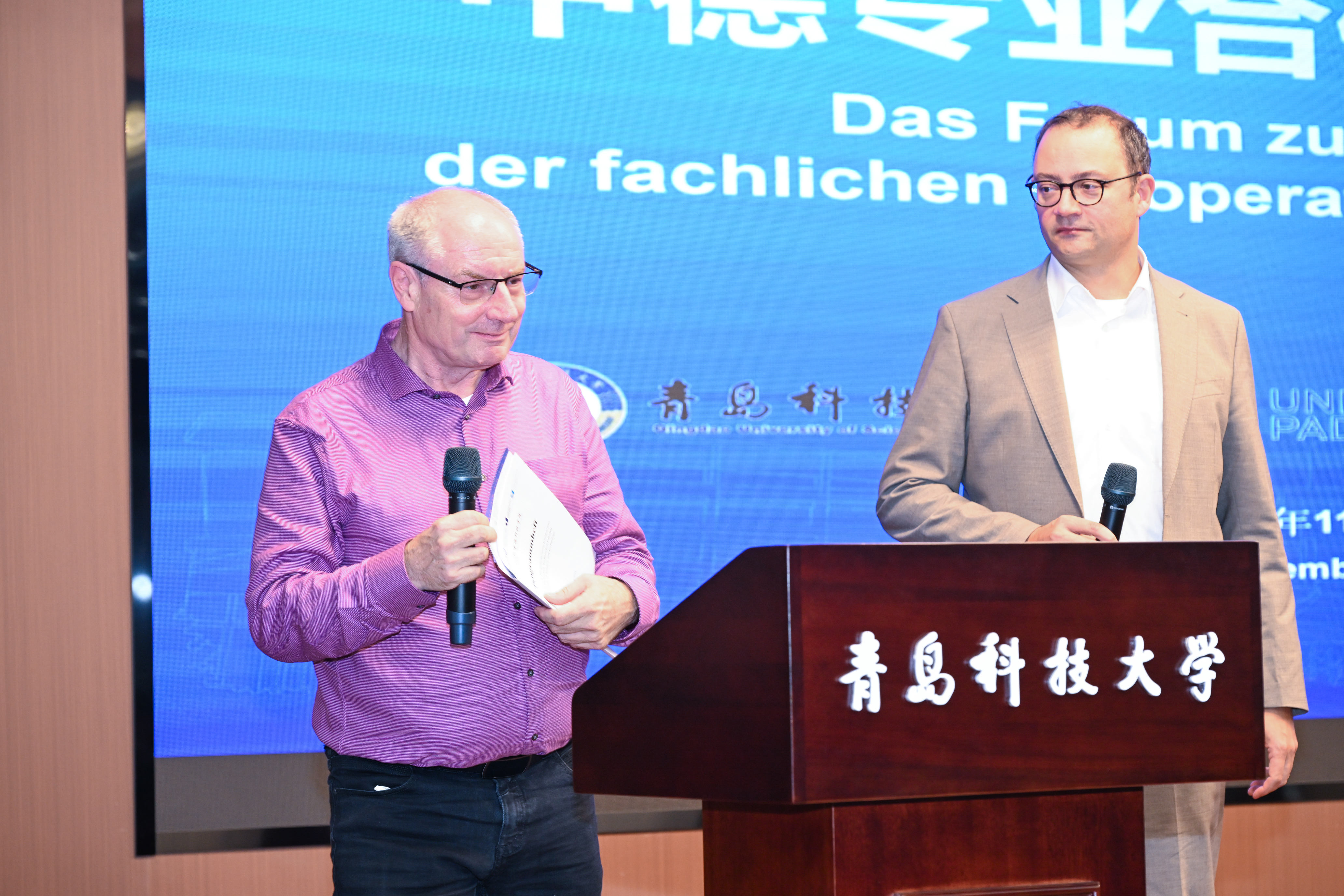 中德科技学院德方副院长布莱姆泽教授及帕德博恩大学自然科学学院物理系主任策德里克·迈尔教授介绍,帕德博恩大学目前开设了类别丰富的课程供中方学生选择,同时学校已具备了从学士、硕士到博士的完整培养体系,学生就业前景光明。后续围绕人才培养帕德博恩大学将为青科大学子提供多方位帮助,为中方学生赴德交流提供更多便利条件。
