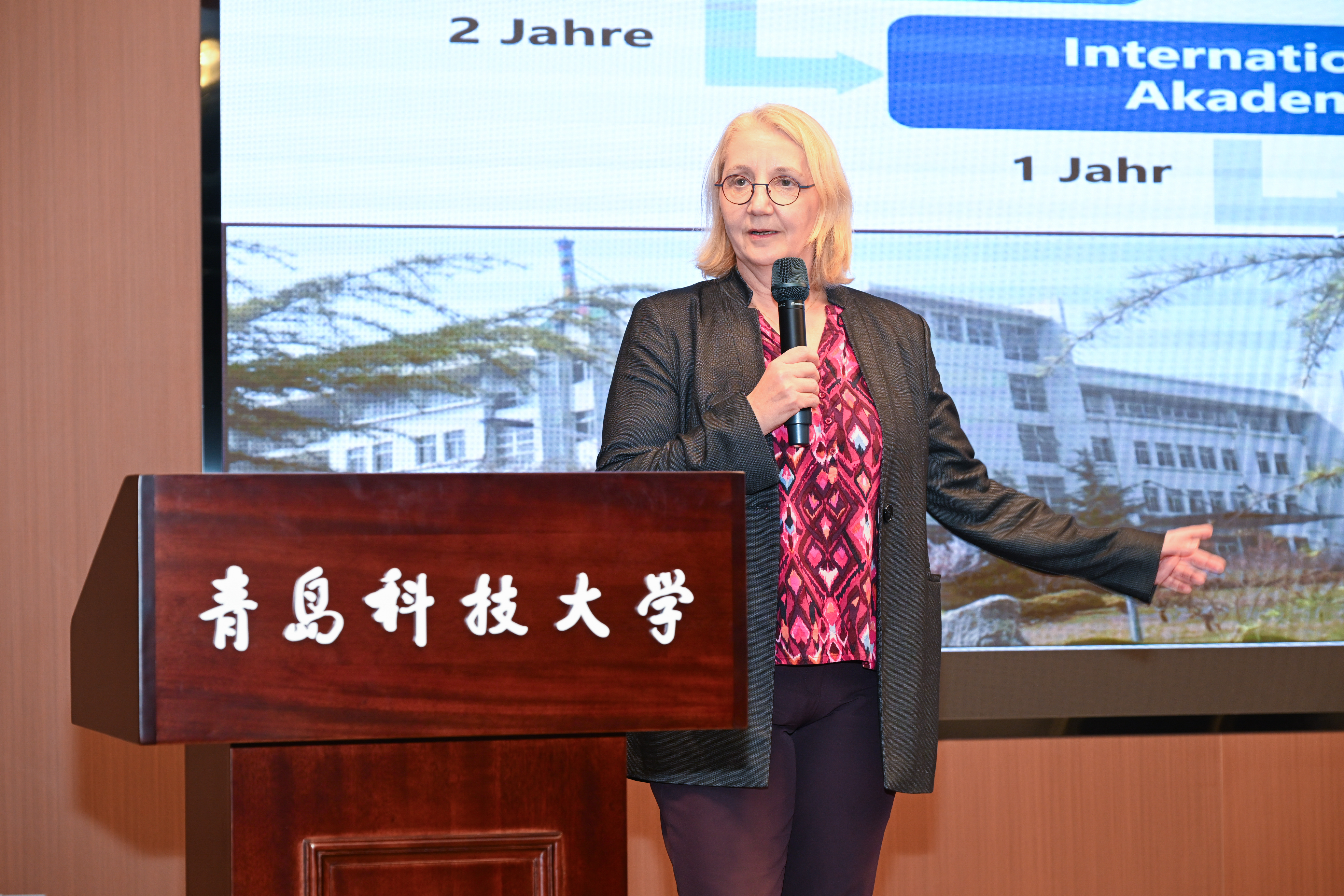 论坛第一阶段,德方高校师生见面会在综合服务楼软控报告厅召开。帕德博恩大学代表邓策博士分别从赴德留学条件、学制安排、专业教学等方面进行了详细介绍,她建议学生们打好语言基础,特别是借助“德语角”活动提升口语并了解德国的学习与生活情况。同时,他表示帕德博恩大学将为中方学生进一步优化课程衔接,将授课内容与学生的知识水平、能力素养相匹配,并提供必要的中文专业辅导以及企业参观实训等多项教辅安排,为中方学生创造更优质的学习环境。