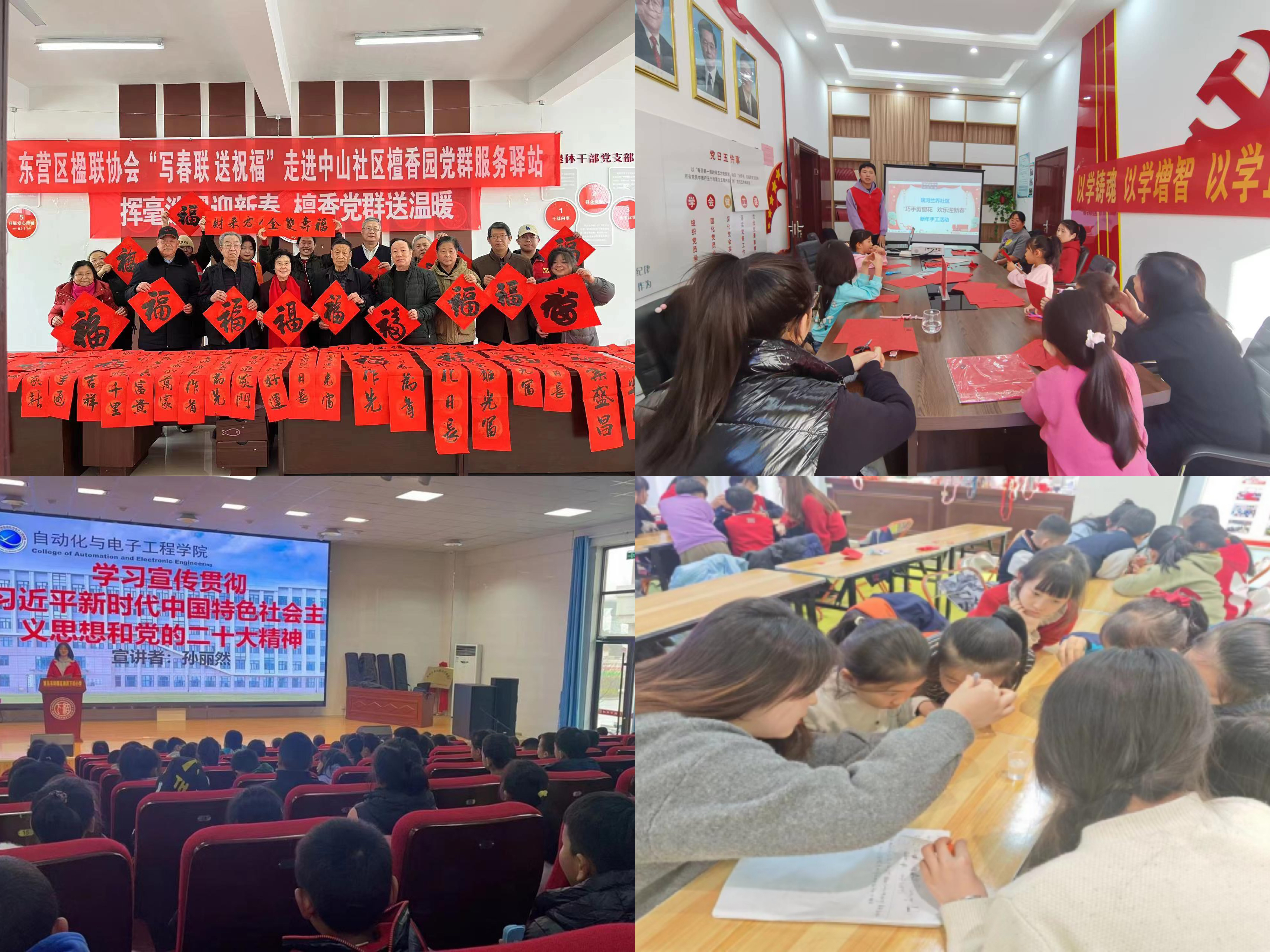 扎根基层,服务社区,让“奉献、友爱、互助、进步”的志愿服务精神在社会中传递,让青年以奋斗者的姿态在社会服务的主战场上建功立业。环境学院团委组织青年志愿者团队在济宁市梁山县通过发放环保知识单页、设置咨询服务台、开展环保科普等方式,把社会实践同自身专业紧密结合,将“创新发展、开放发展、协调发展”的理念深入群众内心。信息学院团委组织“爱心义工队”为泰安市岱岳区社区居民发放新年礼包、清扫院落、破冰除雪,在浓浓年味中传递温情。法学院团委组建“法护黄河青春行,共绘黄河文化韵”生态文明省级实践团队赴东营市进行实地调研黄河口湿地生态区,设立普法摊位,为居民提供法律咨询和宣讲服务,用108个小时为1000人次以上基层社区居民普及《黄河保护法》。自动化学院团委组织青年志愿者赴安徽省宣城市开展“把爱带回家——真情暖童心,相伴护成长”寒假返乡儿童关爱服务,通过阅读领读及作业辅导活动为儿童带去关爱。中德科技学院团委组建“文化进万家”青年志愿服务团队走进滨州市滨城区开展“行走齐鲁·助力研学”、“巾帼送文化”等丰富多彩的文化活动和传统民俗、年俗活动,用实际行动传递传统文化的魅力,丰富了社区群众精神文化生活。数理学院团委组织青年志愿者走进泰安市肥城市社区开展消防安全排查,每天坚持走遍社区大小角落检查消防设施,及时发现并解决安全隐患,有效保障了社区的安全。