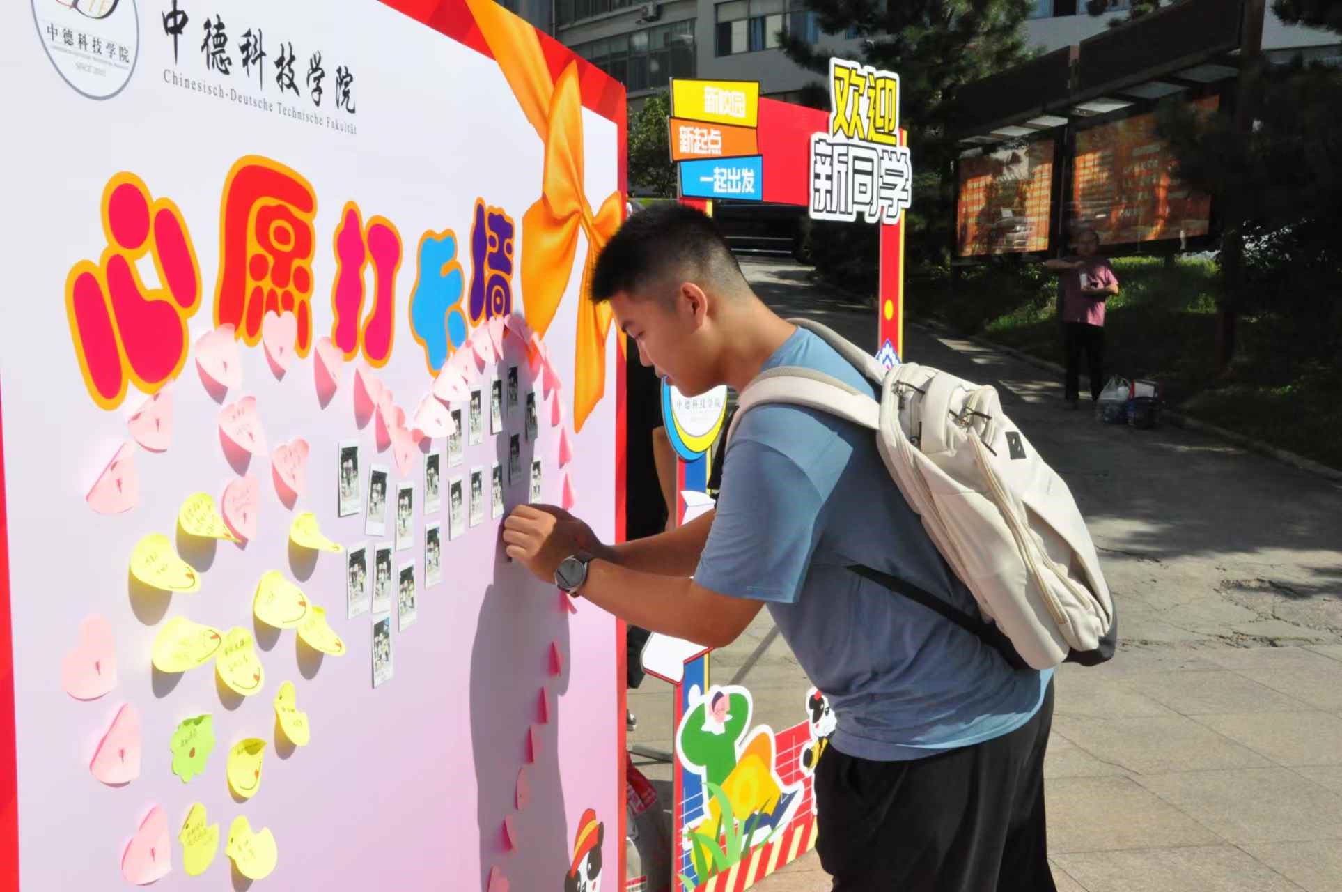 国际化育人,特色彰显。迎新活动融入国际化元素,学院特别制作“七十五载春华秋实庆华诞,筑梦中德奋发有为正当时”主题喷绘,布置迎新站点,赠送包含深情厚意的新生大礼包,以及富含传统文化韵味的床贴与寓意吉祥的门牌。现场设立“书法展示区”,新生挥毫泼墨,以笔墨传情,展现了中德科技学院深厚的文化底蕴与国际视野。