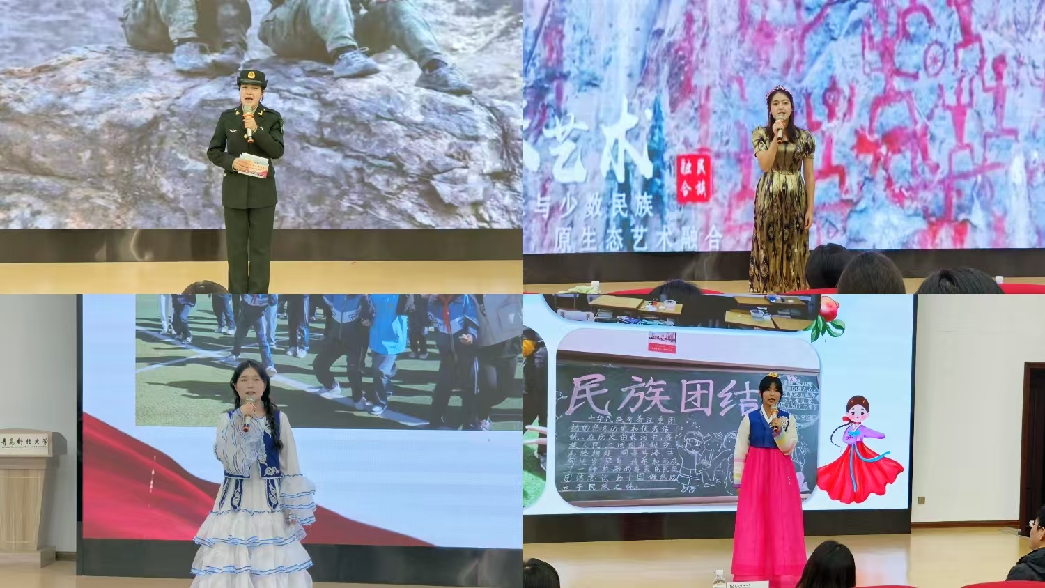 本次比赛共有来自16个学院,9个民族17名选手同台竞技,紧紧围绕“民族团结一家亲”主题,经管学院国贸242班学生张硕讲述了自己在党的关怀培养下成长成才、奋斗拼搏的经历;艺术学院音乐241班学生王莉汶讲述了中华优秀传统文化、新时代民族地区发展;法学院社工221班学生古丽夏提·先米西丁分享了她在军旅生涯中的民族团结真实写照等动人故事。他们以饱满的热情、鲜活的事例和真挚的情感,演绎了一幕幕关于民族团结、家国情怀的动人篇章,充分展现了青科大学子奋斗拼搏的时代担当,传承创新中华优秀传统文化的奋发有为,以及对民族团结和中华民族一家亲的最真挚歌颂,参赛选手的精彩表现赢得了在场观众的阵阵掌声。除此之外,文艺节目环节也精彩纷呈,开场民族舞《石榴花绽放时》以其欢快的旋律、浓郁的民族风情,让在场师生感受到了民族文化的独特魅力;歌曲《爱我中华》,展现了五十六个民族共唱一支歌的真实写照,表达了青科大学子拳拳爱国之情及对党和国家的赤诚之心。