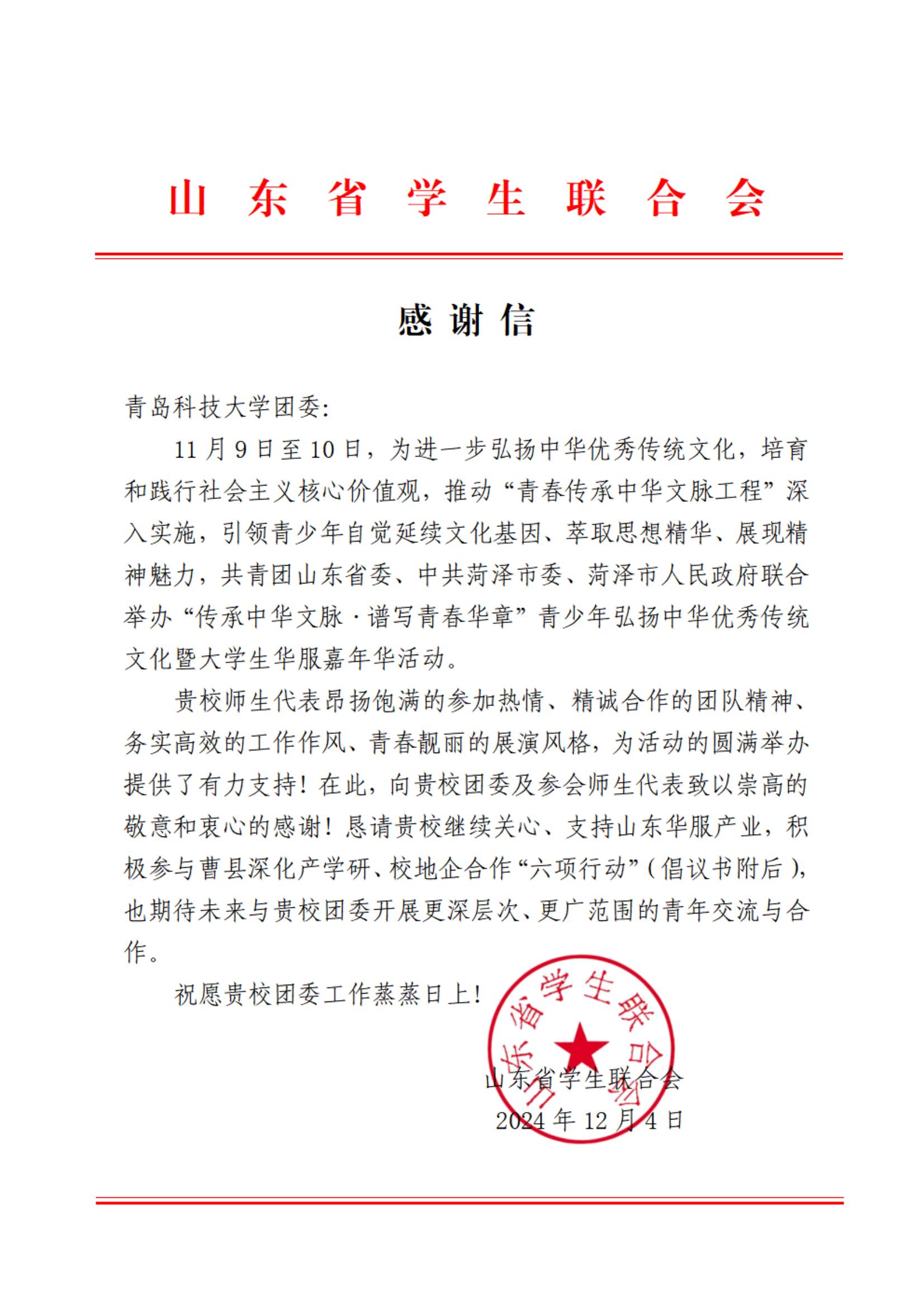 11月9日至10日,由共青团山东省委、中共菏泽市委、菏泽市人民政府联合举办的“传承中华文脉·谱写青春华章”青少年弘扬中华优秀传统文化暨大学生华服嘉年华活动在山东曹县举办。学校学生社团汉韵研习社4名成员受邀参加本次活动。近日,山东省学生联合会向beat365团委发来感谢信,对beat365师生积极参与此项活动表示感谢。