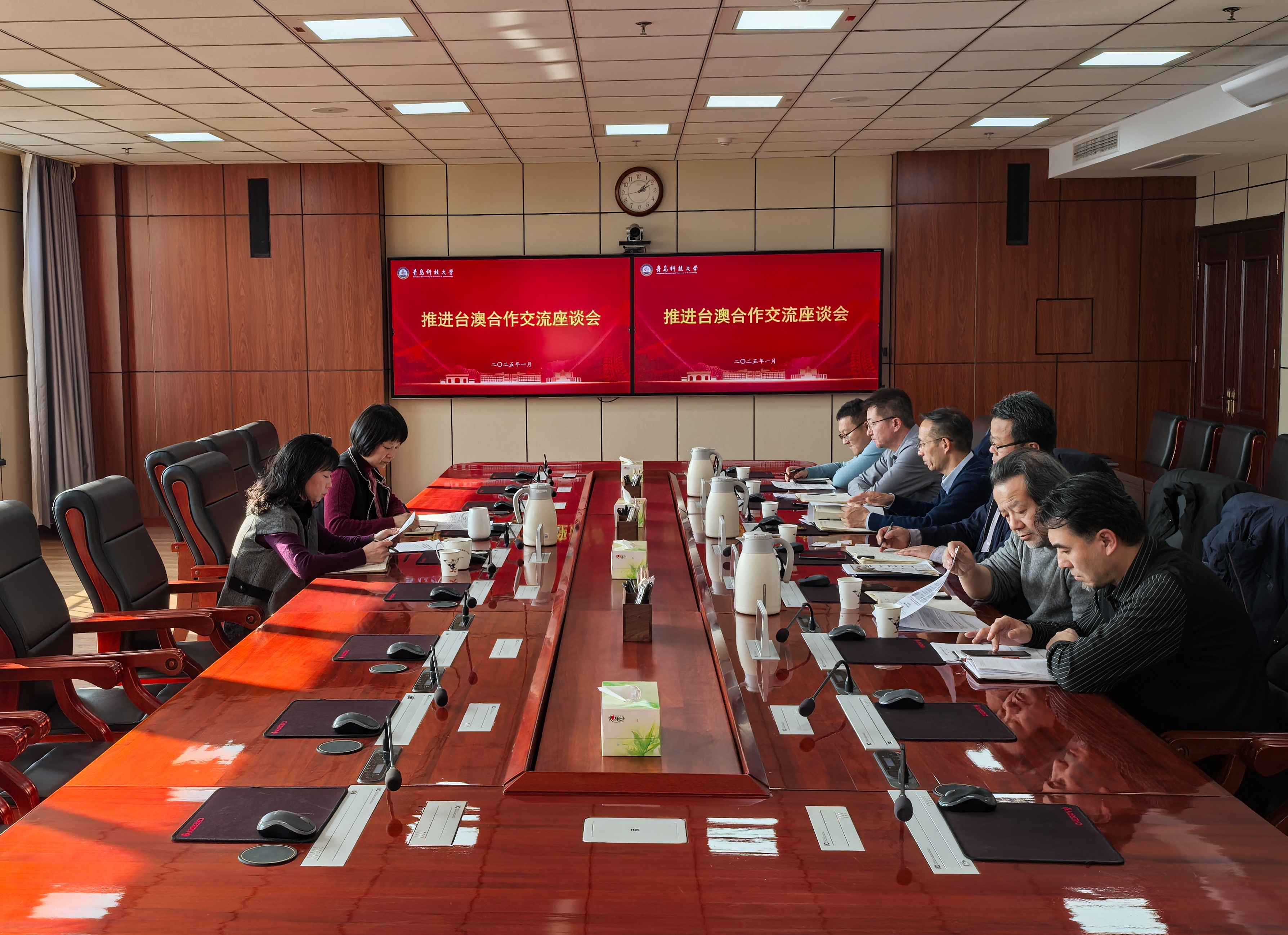 1月2日,推进台澳合作交流座谈会在崂山校区举行,学校党委副书记沈文青出席会议。党委常委、统战部部长兼台港澳侨办公室主任秦姣主持会议。