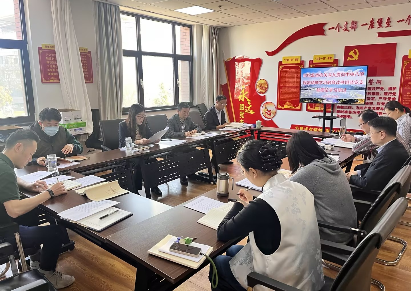 会上,相关同志领学了中央八项规定及其实施细则精神、《习近平关于加强党的作风建设论述摘编》相关内容。与会人员就理论学习的内容开展了交流研讨。会后,全体纪检监察干部参观了学校“岱青海蓝、廉铸初心”廉洁文化作品展。