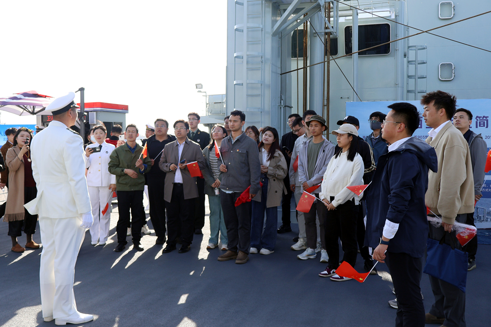 传媒学院辅导员刘福民表示:“第一次零距离参观海军现役舰艇,深刻感受到人民海军76年来的发展变化,这是一堂生动的军舰思政课,让我更好的了解大国重器,更好的领悟向海图强。”退役大学生代表王雨璇表示:“作为一名海军退役士兵,登上海军舰艇让我心潮澎湃,军旅生涯的记忆如潮水般涌上心头,深刻感受到人民海军不断发展壮大,新型装备层出不穷,我感到自豪和欣慰。我坚信新征程中,人民海军必将乘风破浪,驶向更辽阔的深蓝,守护祖国万里海疆。”