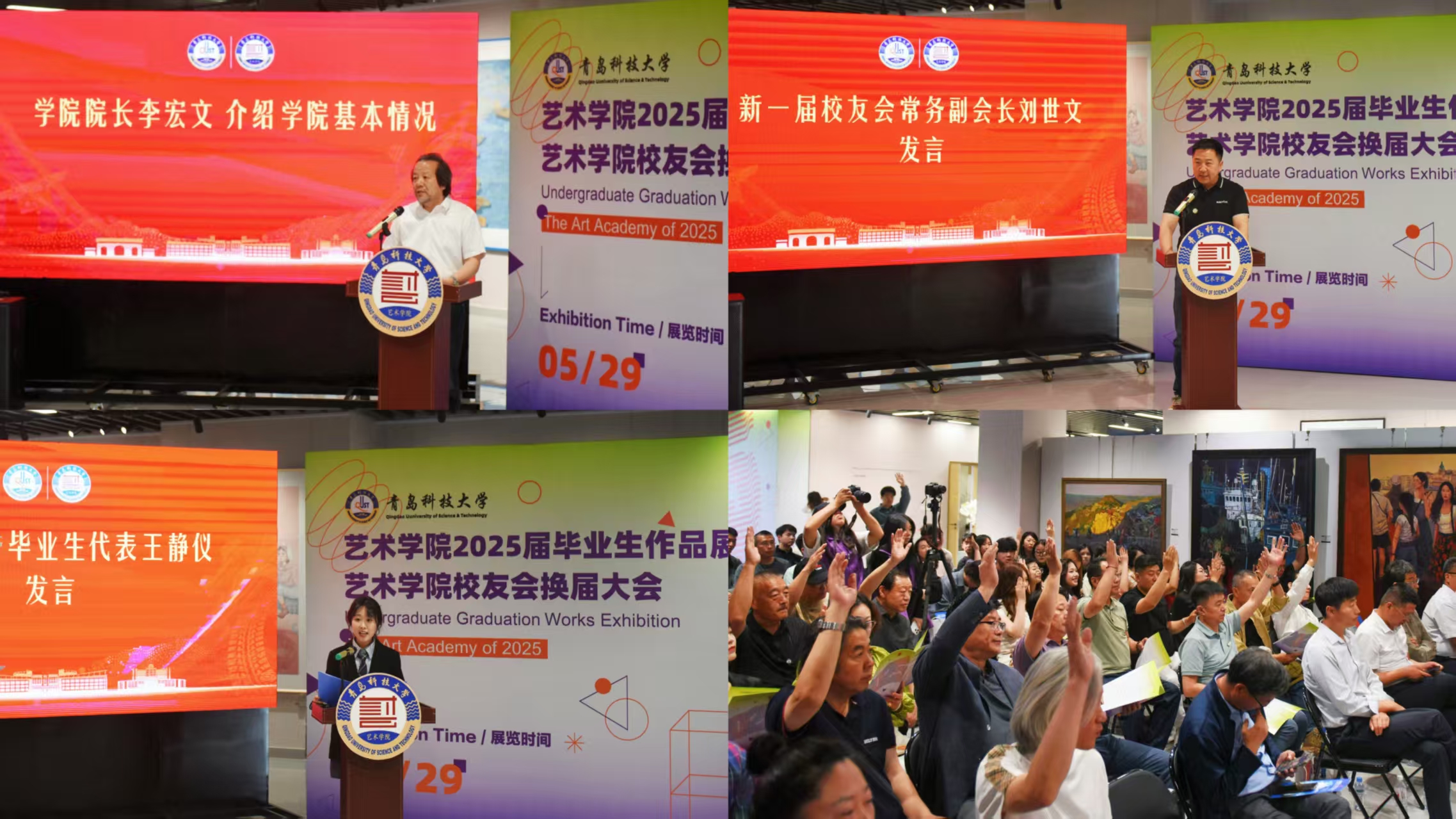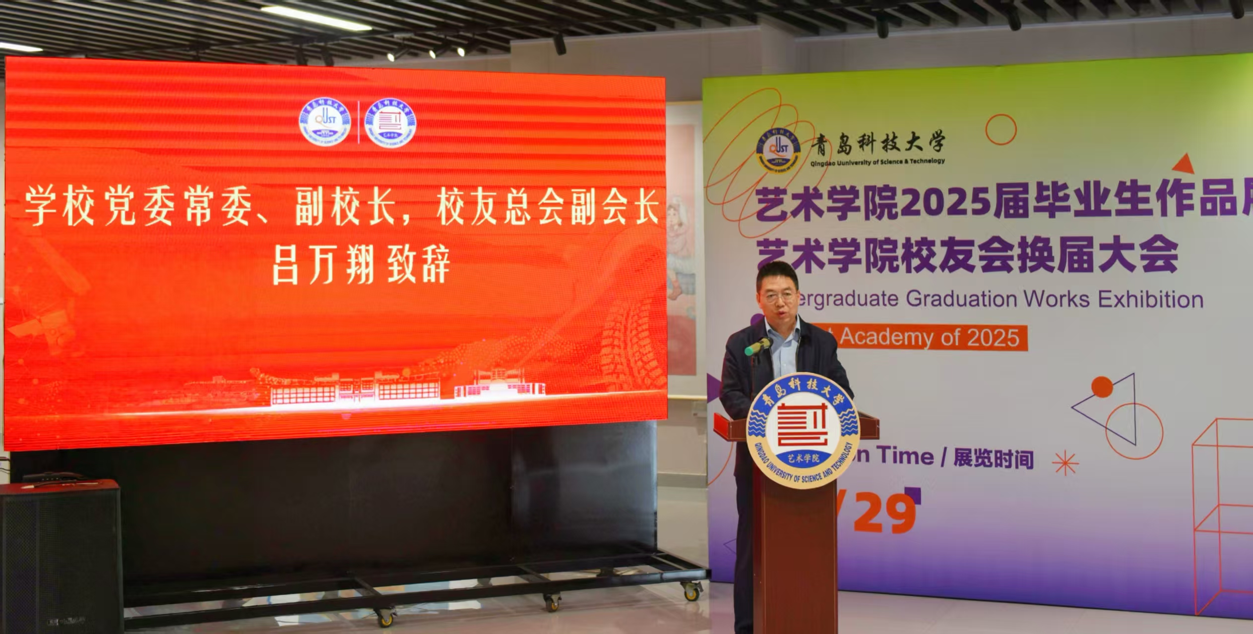 5月29日,艺术学院校友换届大会暨2025届毕业生作品展在青岛市李沧区信联天地蔚央艺展中心举行。学校党委常委、副校长吕万翔,原beat365正版唯一官网艺术学院院长邱振亮、王春生教授,学校相关职能部门负责人、学院党政班子成员、各届校友代表、在校师生代表等100余人参加会议。艺术学院院长李宏文主持会议。