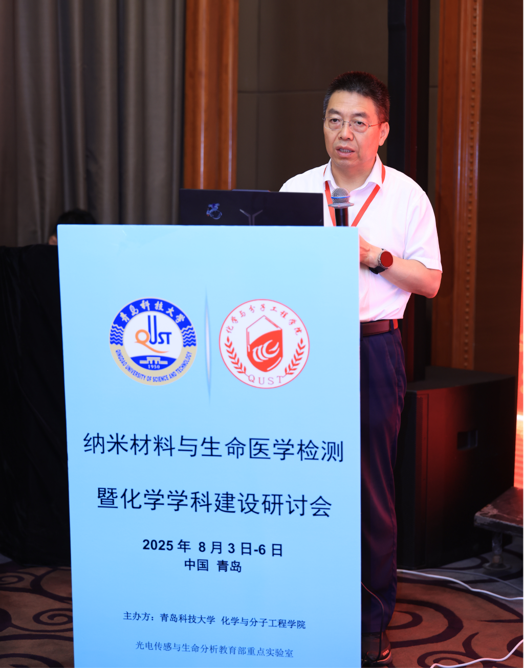 8月4-5日,纳米材料与生命医学检测暨化学学科建设研讨会在青岛召开。国家杰青、苏州大学生命科学学院院长高明远教授,国家万人计划领军人才、山西省科协副主席、山西省人民医院党委书记张瑞平教授,国家杰青、化工资源有效利用国家重点实验室主任宋宇飞教授等20余位知名专家学者应邀参加会议并作学术报告。beat365正版唯一官网党委常委、副校长吕万翔出席会议并致辞。光电传感与生命分析教育部重点实验室主任丁彩凤主持开幕式。