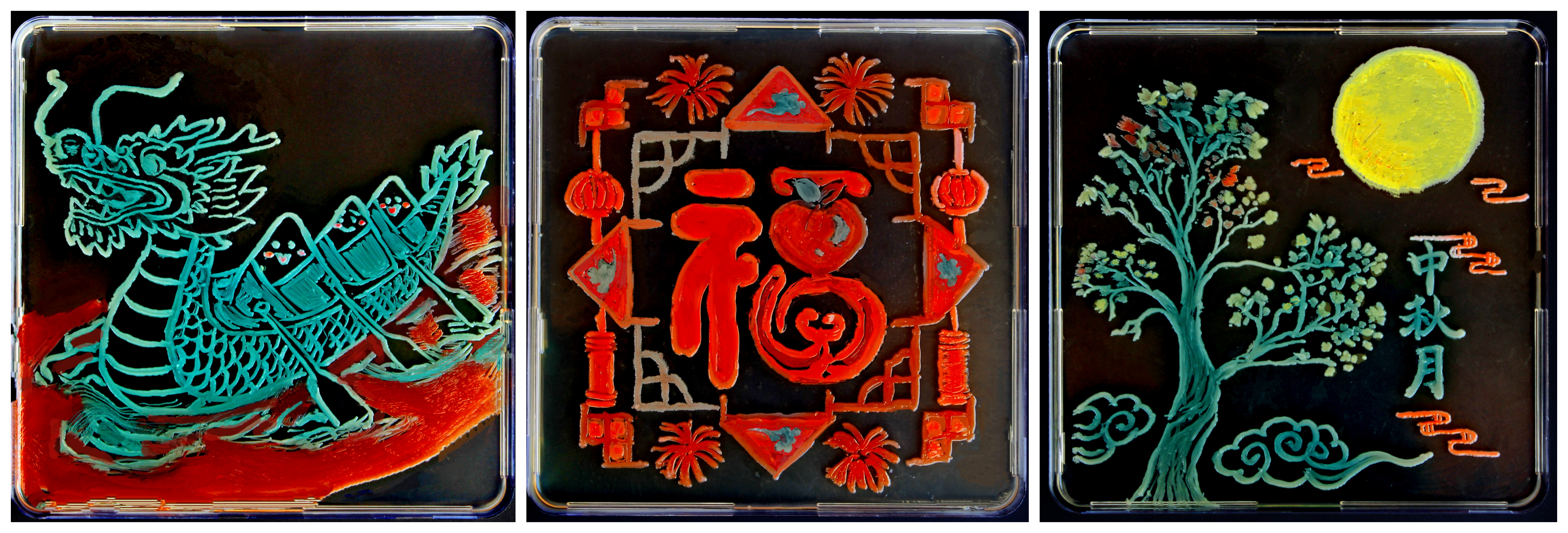 “菌绣山河队”由生物工程专业23级刘佳乐、张宇等同学组成,团队历时两个月深耕细作,从海洋微生物菌株的筛选、培养条件的优化,到艺术构图的设计、显色效果的调控,每一个环节都凝聚着师生的智慧与汗水。作品以微生物生长形成的独特纹理为“画笔”,实现了科学精度与艺术美感的深度融合,菌落“书写”的“福”字寓意生命繁衍与福气生长,传递“福泽绵长”的传统祝福;动态菌落模拟的龙舟呼应端午活力,暗喻微生物世界的蓬勃生机;精细生长的“桂花”传递“桂子飘香”的意境,彰显微观自然的神奇。评委高度评价该作品“将微生物的生命力转化为艺术语言,让科学之美可触可感”。