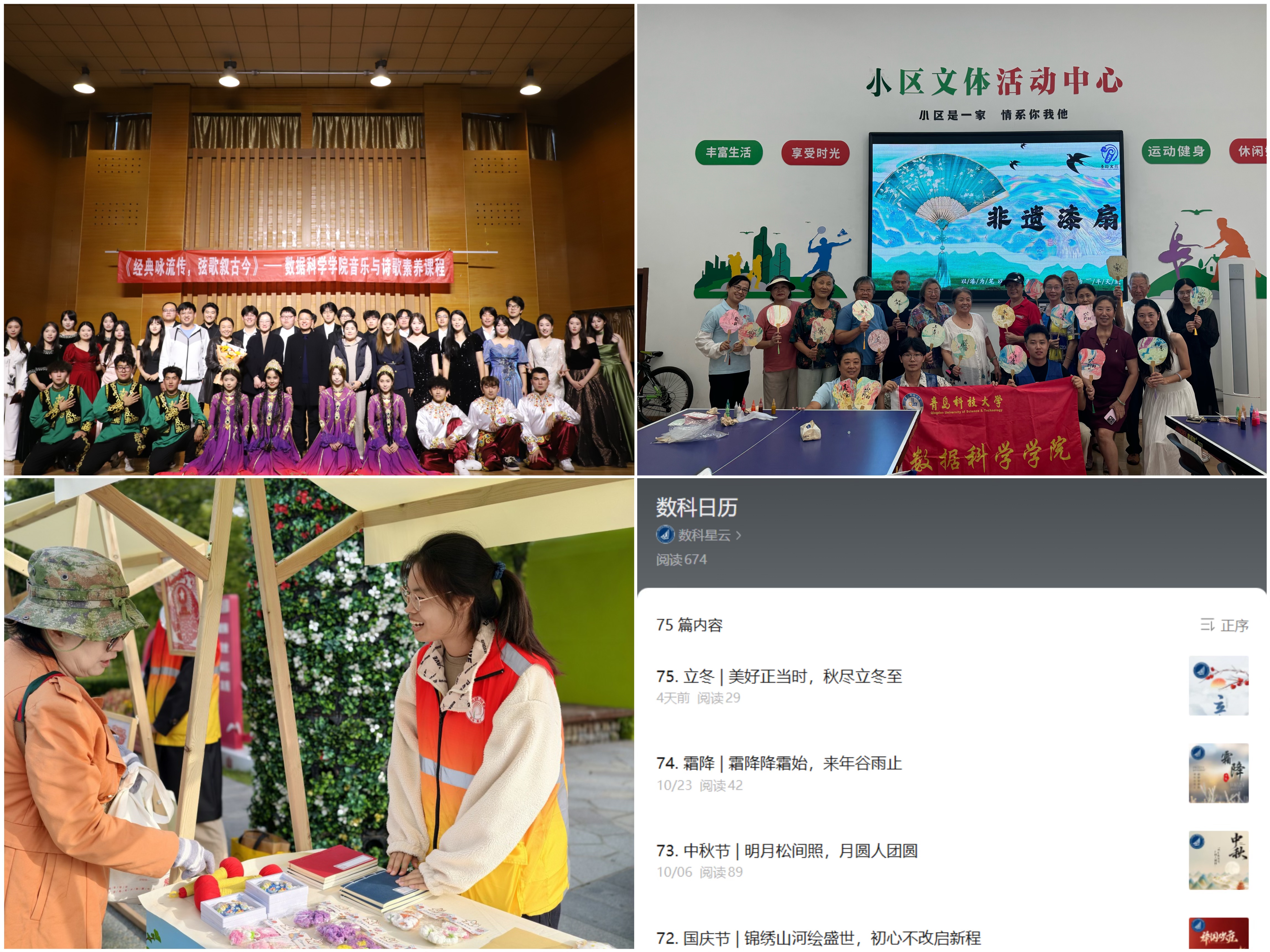 第四课堂联动,弘扬文化新风。学院依托官方微信公众号,精心打造“数科日历”特色文化栏目,以传统节日、二十四节气为天然传播脉络,持续推送兼具知识性与趣味性的原创推文,让文化传播更具吸引力与感染力。截至目前,栏目已累计推送推文75篇,学生全程参与选题策划、文案撰写、海报设计全流程,在创作中加深了对传统文化的理解与认同,让云端平台成为培育文化自信的重要阵地,构建起线上线下联动的人文素养培育新模式。