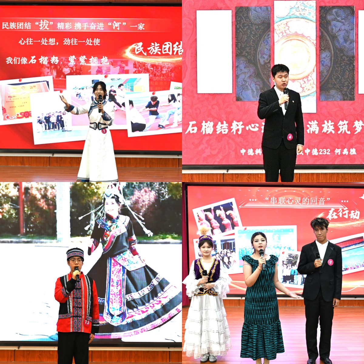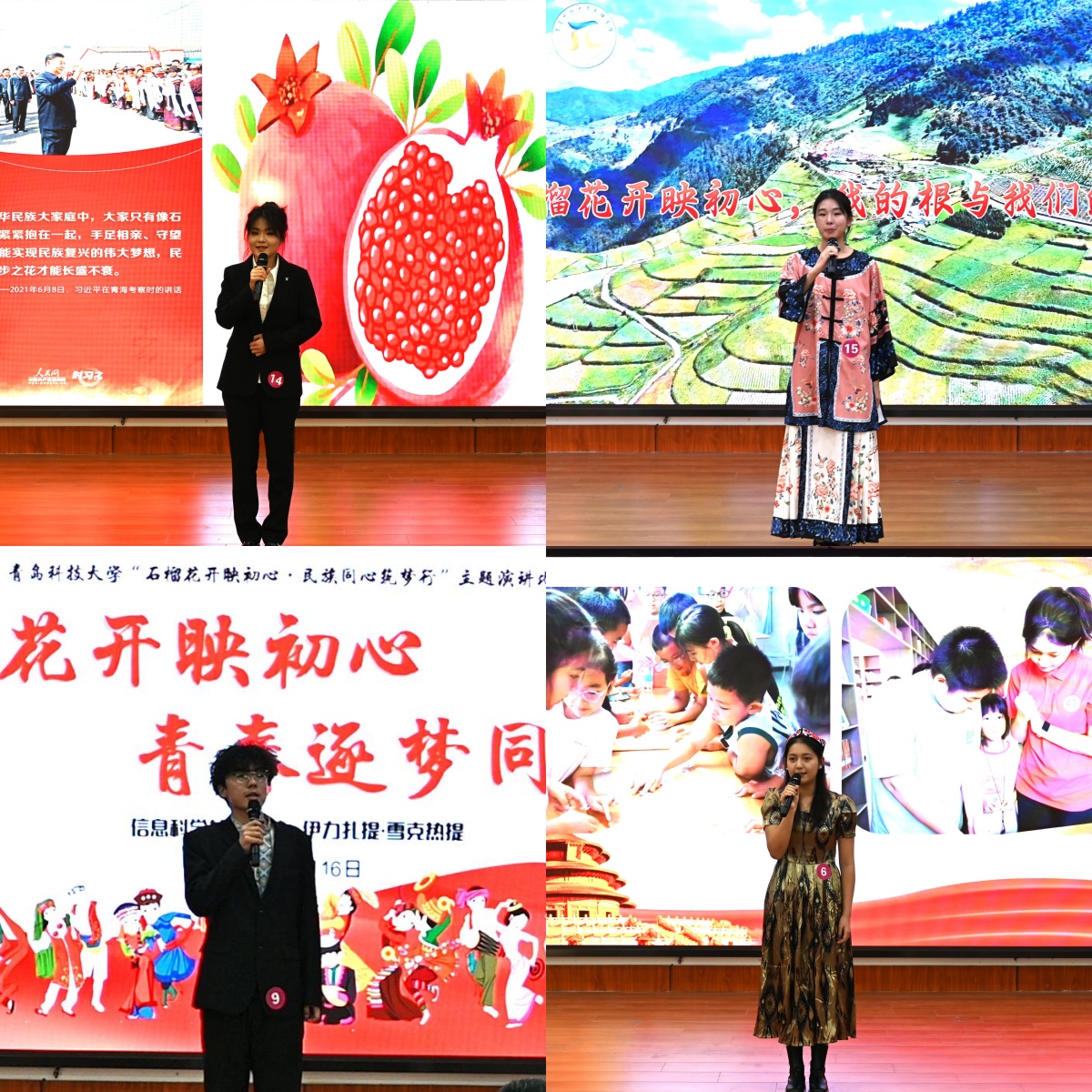 本次比赛共有来自17个学院、8个民族的20名选手同台竞技。选手们紧紧围绕“民族团结一家亲”主题,结合亲身经历,以饱满热情、鲜活案例和真挚情感,生动诠释民族团结的深刻内涵与家国情怀的时代价值,充分展现出青科学子拼搏奋进的责任担当。中德科技学院机械中德232班学生何禹樵以满族盘长结刺绣为引,分享了各民族互嵌共融的温暖日常;法学院法学251班学生买热排提・阿卜杜力艾海提以自身成长轨迹为脉络,借“石榴花”的意象串联不同地域、不同民族间的温暖相助与文化交融故事,诠释“中华民族一家亲”的深刻内涵;化学院化学242班学生艾合拜・吾木尔分享了推普实践队的故事,展现了新时代青年以专业与热情践行民族团结、回馈故乡的初心与使命。他们出色表现赢得了在场观众的一致好评与热烈掌声。