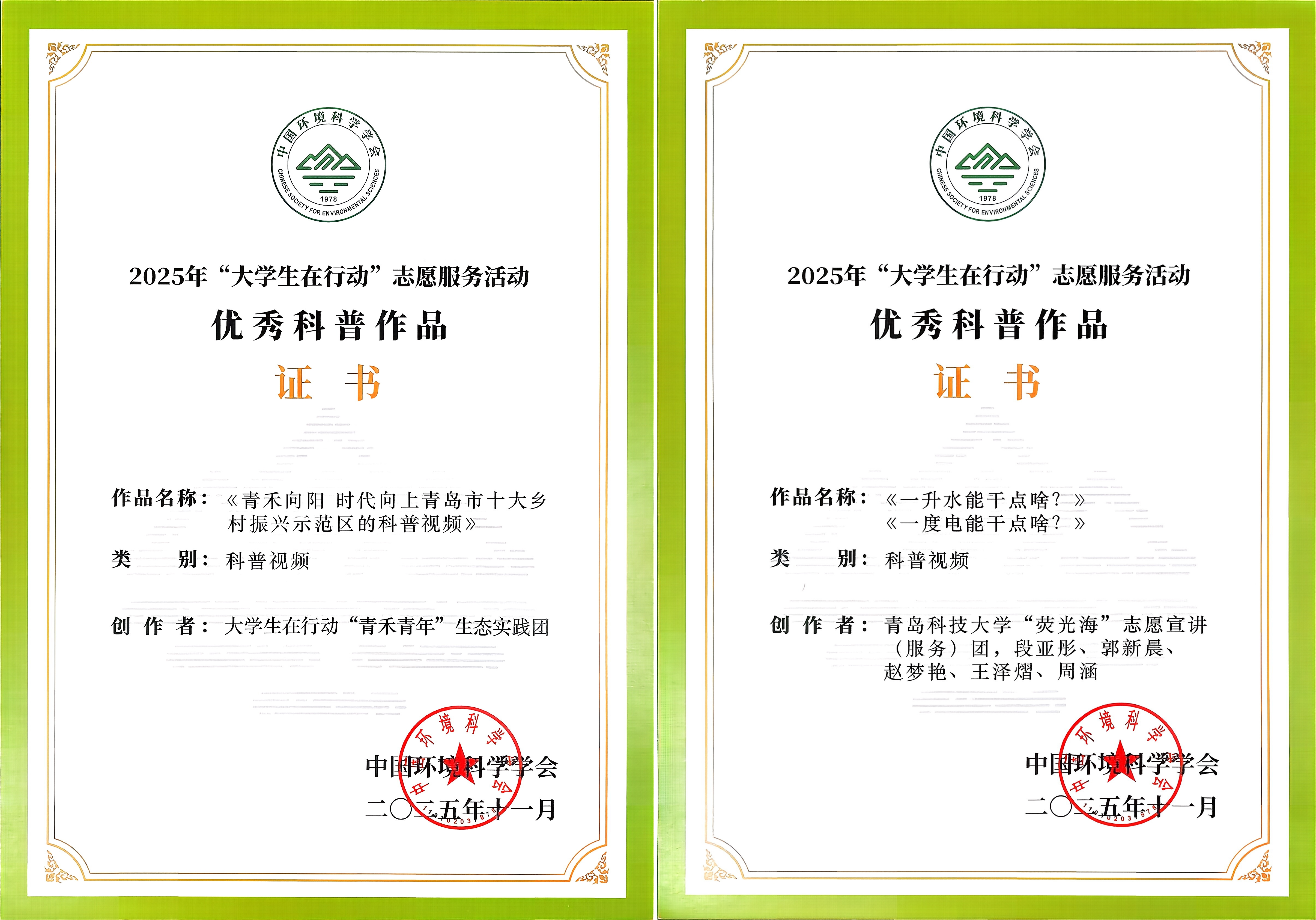日前,由中国环境科学学会组织的2025年度“大学生在行动”科普志愿活动优秀组织单位和个人的评选结果揭晓,beat365生物工程学院“青禾青年”生态实践团、机电学院绿滩实践队获评“优秀小分队”;生物工程学院田笑溢、机电学院李世熜获评“优秀志愿者”;生物工程学院作品《青禾向阳 时代向上 青岛市十大乡村振兴示范区的科普视频》《一升水能干点啥?一度电能干点啥?》获评优秀科普作品;生物工程学院郭颖获评优秀指导教师。