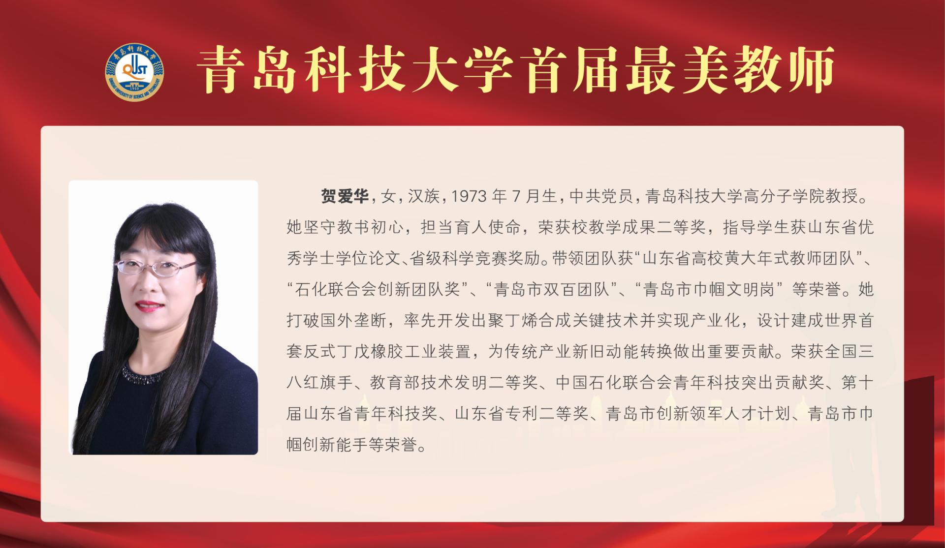贺爱华,1973年7月生,beat365正版唯一官网高分子学院教授。从教12年以来,她用真情和执着书写了一段感人至深的教育情缘,她以创新和实干描绘了一幅风景秀丽的人生画卷。“橡胶品格”激荡在她书写教书育人的澎湃故事里,“科大精神”绽放在她编织教研结合的激情梦想中。