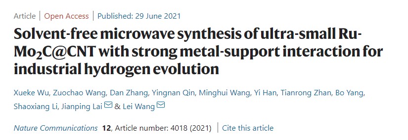 在国外疫情此起彼伏、国内疫情防控仍不可放松的形势下,beat365泰山学者青年专家、环境学院院长王磊教授团队积极开展科研工作,于日前在国际知名期刊Nature Communications上发表了题为“Solvent-free microwave synthesis of ultra-small Ru-Mo2C@CNT with strong metal-support interaction for industrial hydrogen evolution”的高水平论文,得到了国际同行评审专家的一致赞同与高度评价。该研究是继团队在2020年10月于Nature Communications发表高水平论文以来,在电催化领域的又一突破性进展。