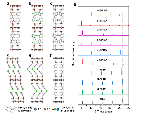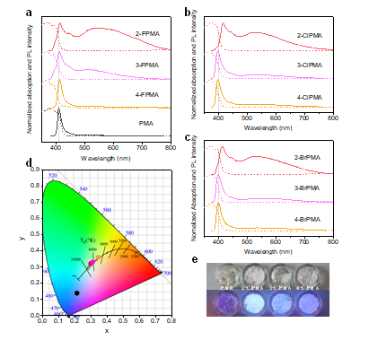 低维有机无机混合钙钛矿材料作为白光发射体表现出优异的性能,其宽带白光发射来源于自陷激子。由于钙钛矿材料中自限域的形成机制尚不清楚,因此制备新型白光发射钙钛矿主要依赖于筛选大量有机分子。对此,邢军教授等人报道了一种卤素原子取代策略构建新型白光钙钛矿材料。卤素取代基会从苯基分子的支链(-R-NH3+) 中提取电子,导致 -R-NH3+上的正电荷积累,促进激子自陷域形成。该白色钙钛矿的光致发光量子产率为32%,显色指数接近 90,色度坐标接近标准白光。该研究将为设计制备更多新型的白光钙钛矿材料提供实验方法与理论指导。