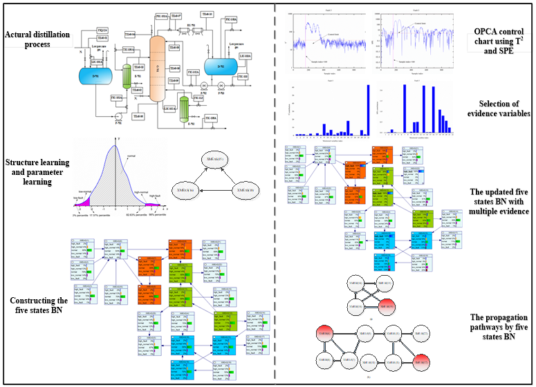 其中,文章“An intelligent quantitative risk assessment method for ammonia synthesis process”针对动态化工过程潜在风险难以预测的情况提出了一种智能的定量风险评估方法(如图1),通过深度学习技术捕捉工艺变量的深层特征,评估工况的风险等级,最终制定控制方案,保证工艺的安全运行。文章“Optimized principal component analysis and multi-state Bayesian network integrated method for chemical process monitoring and variable state prediction”针对化工企业异常工况根原因追溯困难的实际难题,提出了一种先进的过程监控方法(如图2),通过改进PCA以及构建新型多状态贝叶斯网络,做到全面的故障传播路径分析,保障化工企业的安全生产以及异常工况的提早处置。两篇文章均以beat365正版唯一官网为第一单位,化工学院田文德教授为论文的通讯作者,博士研究生刘子健、硕士研究生柳楠分别为两篇论文的第一作者,实验室老师刘彬、李传坤、崔哲参与指导工作。