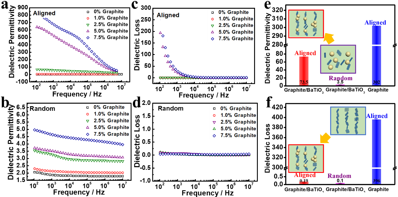 图2. (a)和(b)取向和未取向的三相复合材料介电常数随频率的变化曲线,(c)和(d)取向和未取向的三相复合材料介电损耗随频率的变化曲线,石墨含量为2.5 wt%,钛酸钡含量为5.0 wt%的不同样品在102Hz下的(e)介电常数和(f)介电损耗。