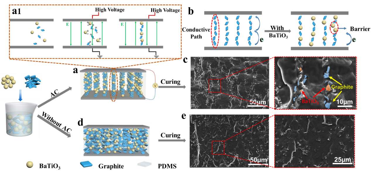 近日,beat365正版唯一官网张建明、陈玉伟等科研工作者合作在复合材料领域TOP期Composites Science and Technology上发文提出了一种基于电场诱导偶极-偶极相互作用同时组装导电和绝缘粒子在高分子基体中形成微纳链状结构的策略,该法可以制备高介电常数、低介电损耗的高分子复合材料。在电场取向过程中,绝缘的BaTiO3粒子可以作为屏障巧妙地嵌入石墨粒子导电通路中(图1),这种形态的形成对于平衡导电填料/聚合物复合材料的高介电常数和相对低的介电损耗起着重要作用。该策略通过介电泳力(图1a1)将绝缘粒子直接组装到导电粒子形成的通路中,制备过程简便易操作,并且还可以防止填料粒子的团聚,所制备复合材料可用于人体运动监测。