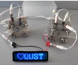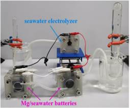 图2镁/海水电池驱动发光二极管(左),镁/海水电池驱动海水电解制氢装置(右)