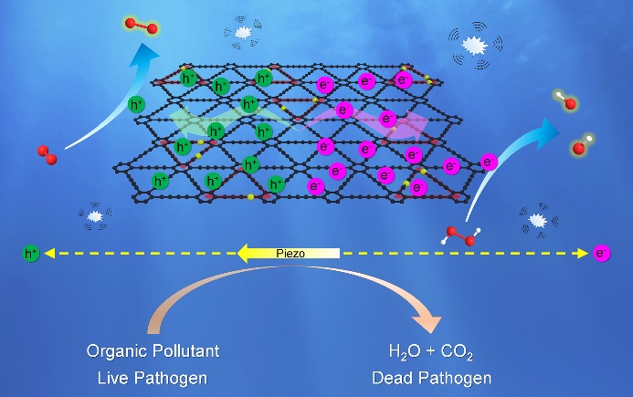 压电场增强石墨炔纳米酶性能。团队通过硫原子掺杂合成了含有丰富缺陷和空位的硫掺杂石墨炔纳米片,硫原子的引入使石墨炔在超声作用下能够显著提高其纳米酶性能。将此纳米酶应用于污水处理中,有较高的TOC去除效率,同时还具有良好的抗菌性能。该工作发表在Nano Today(2022, 43, 101429,影响因子: 20.722)上,beat365博士生白强为该论文的共同一作,隋凝副教授、朱之灵副教授和王兆波教授为共同通讯作者,beat365为唯一通讯单位。