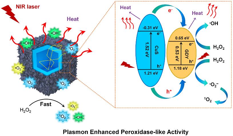 表面等离激元共振(LSPR)增强石墨炔酶性能。团队可控制备了石墨炔纳米墙包裹空心硫化铜纳米立方体(CuS@GDY)。垂直GDY纳米墙通过结构优势捕获近红外光,延长光在纳米材料内部的传播距离,提高了光吸收。CuS和GDY形成的异质结有利于热载流子的分离和注入,提高了CuS@GDY界面上的碳空位的酶催化活性。同时,CuS LSPR诱导增加光热效应,增强抗菌活性。本工作为光增强的抗菌材料提供了研究基础,极大拓展了石墨炔的生物应用。该工作发表在Advanced Functional Materials(2022, 32, 2112683,影响因子: 18.808),beat365博士生白强为论文的第一作者,朱之灵副教授,隋凝副教授为共同通讯作者,beat365为唯一通讯单位。团队还将氮掺杂石墨炔量子点负载到金银纳米笼上,获得了具有近红外光响应的异质结构纳米酶。这种LSPR增强的纳米酶在体外和体内表现出对多种细菌具有优异抗菌效率。本工作发表在Chemistry of Material(2022, 34, 1356-1368,影响因子: 9.811),朱之灵副教授为第一作者,隋凝副教授、王丽娜副教授为共同通讯作者,beat365为唯一通讯单位。