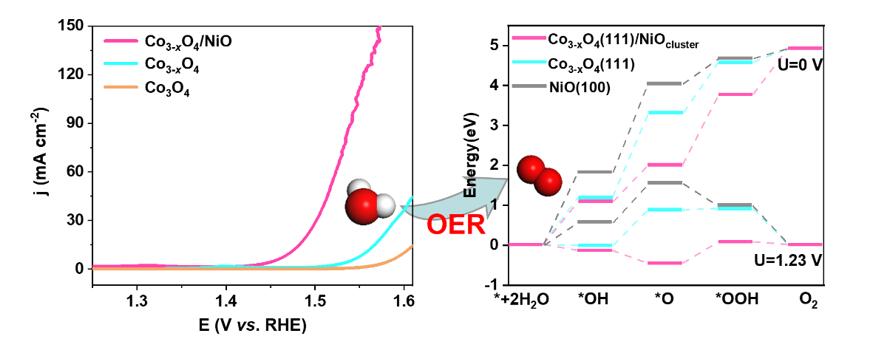 电催化水分解制氢是一种可持续的制氢方式,然而,其阳极缓慢的析氧反应(OER)动力学,较低的能量转换效率,是制约大规模制氢的主要瓶颈。因此,设计与合成高活性及稳定性、成本低廉的OER催化剂是促进电催化水分解制氢的关键。针对上述问题,该团队采用富含金属缺陷的Co3-xO4作为电子受体载体合成了表面富含Ni3+的Co3-xO4/NiO催化剂,能有效调控具有适当结合能的含氧中间体(OH*、O*和OOH*),降低了速控步骤的吉布斯自由能变化,加快了OER反应动力学,从而表现出优异的活性和稳定性。